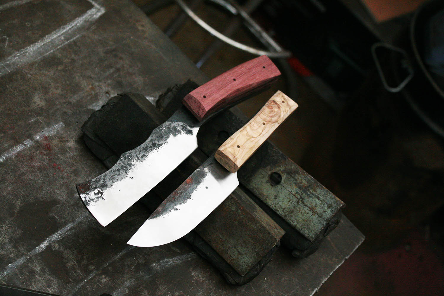 2 potes, 2 couteaux forgés, et un bon stage de forge comme on les aime ! Olivier et amarante pour les manches !