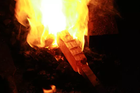 Lorsque la trousse (empilement de départ) est réalisée, il faut procéder à la première chauffe. Pour cella on préfèrera la forge à gaz, car plus pratique pour bien discerner les température. La forge à charbon fonctionne aussi très bien, et l'Humanité a réalisé des chef d'œuvre avec du "simple" charbon de bois :). Il faut juste un peu plus de maîtrise.