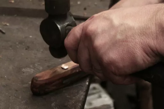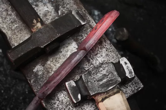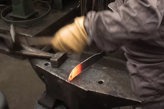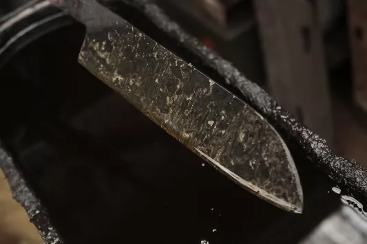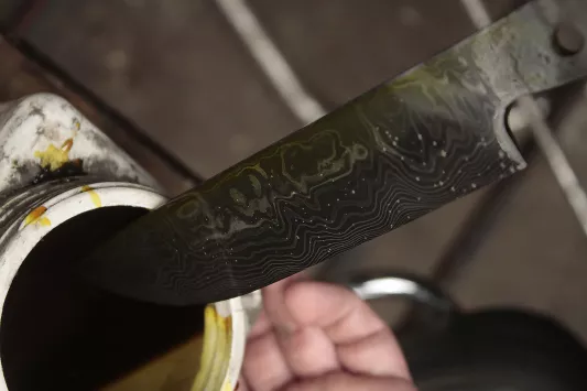 En plus d'éviter d'usiner trop la lame, l'étape de forgeage permet d'allonger la matière et de modifier le motif du feuilletage. En effet, le sens du martelage ainsi que sa profondeur aura une grande incidence sur le sens des couches et le rendu final. Il faut de la maîtrise et de la technique pour bien anticiper ce que l'on veut faire et obtenir comme motif.