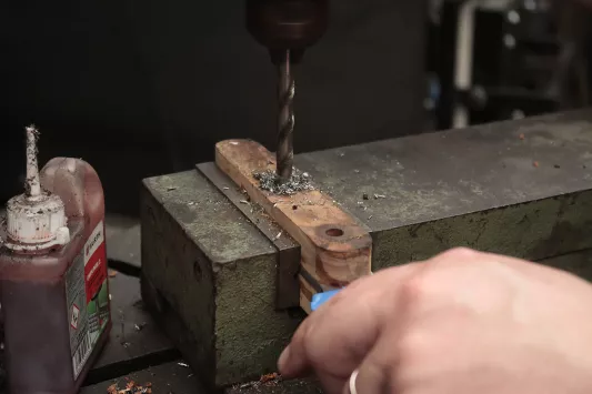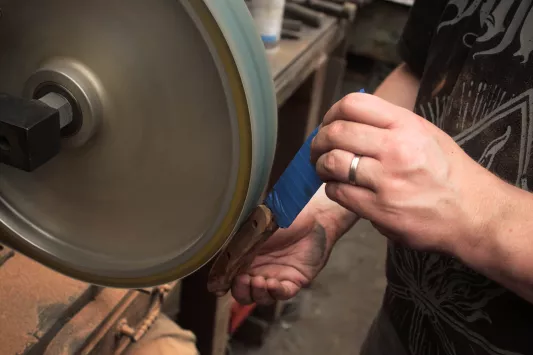 Après les étapes de forgeage, vient celle de l'ajustage. Fraiseuse, backstand, touret, lime, tout peut être mis en œuvre pour réussir à atteindre la forme de lame souhaitée. On usine la lame au plus prêt de ses proportions finales
