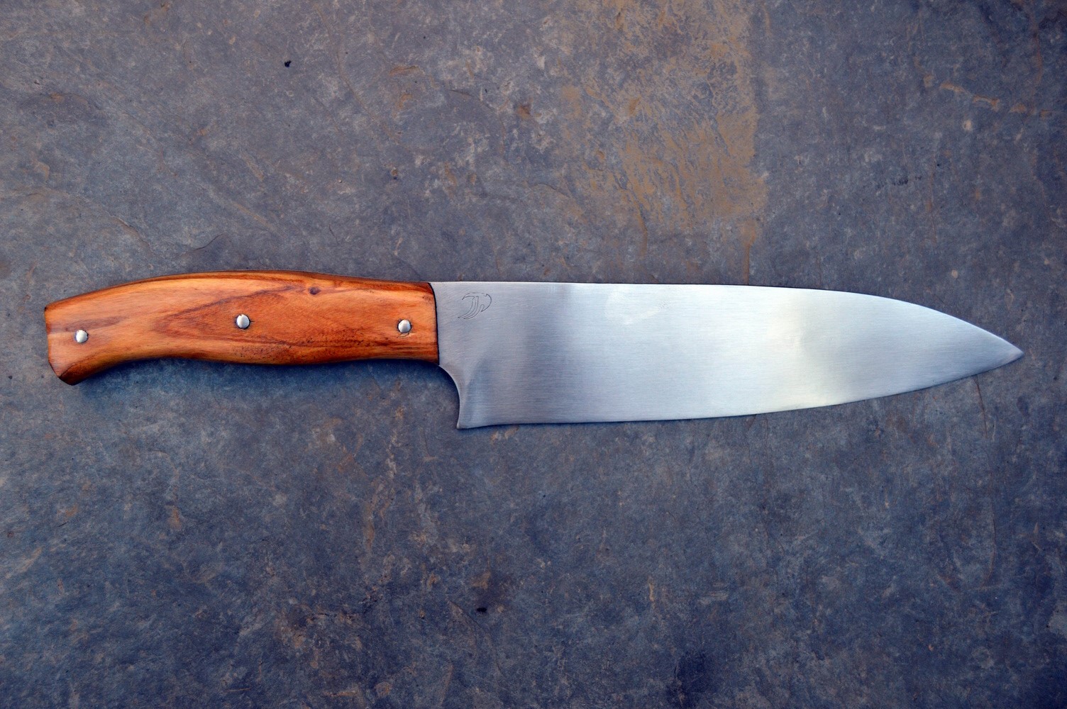 Manche en Olivier de 13.5cm - Lame de 20cm forgée en acier XC90 - Hauteur de 4cm - Epaisseur env 3mm - Rivets aciers.