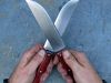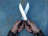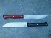 Chaque manche est bicolore (Eben+Padouk) et inversé par rapport à l'autre - lame de 18cm forgée en acier XC80 - Epaisseur env 3mm - Rivets aciers.
