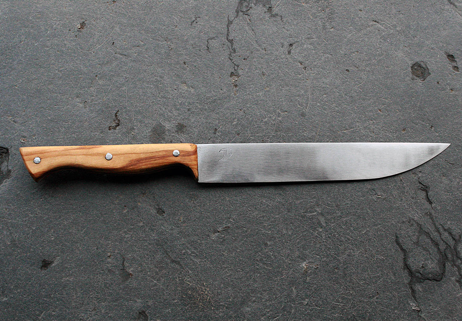 Manche en olivier de 13cm - Lame de 19cm forgée en acier XC90 - Epaisseur de 3 à 0.5mm - Rivets aciers.
