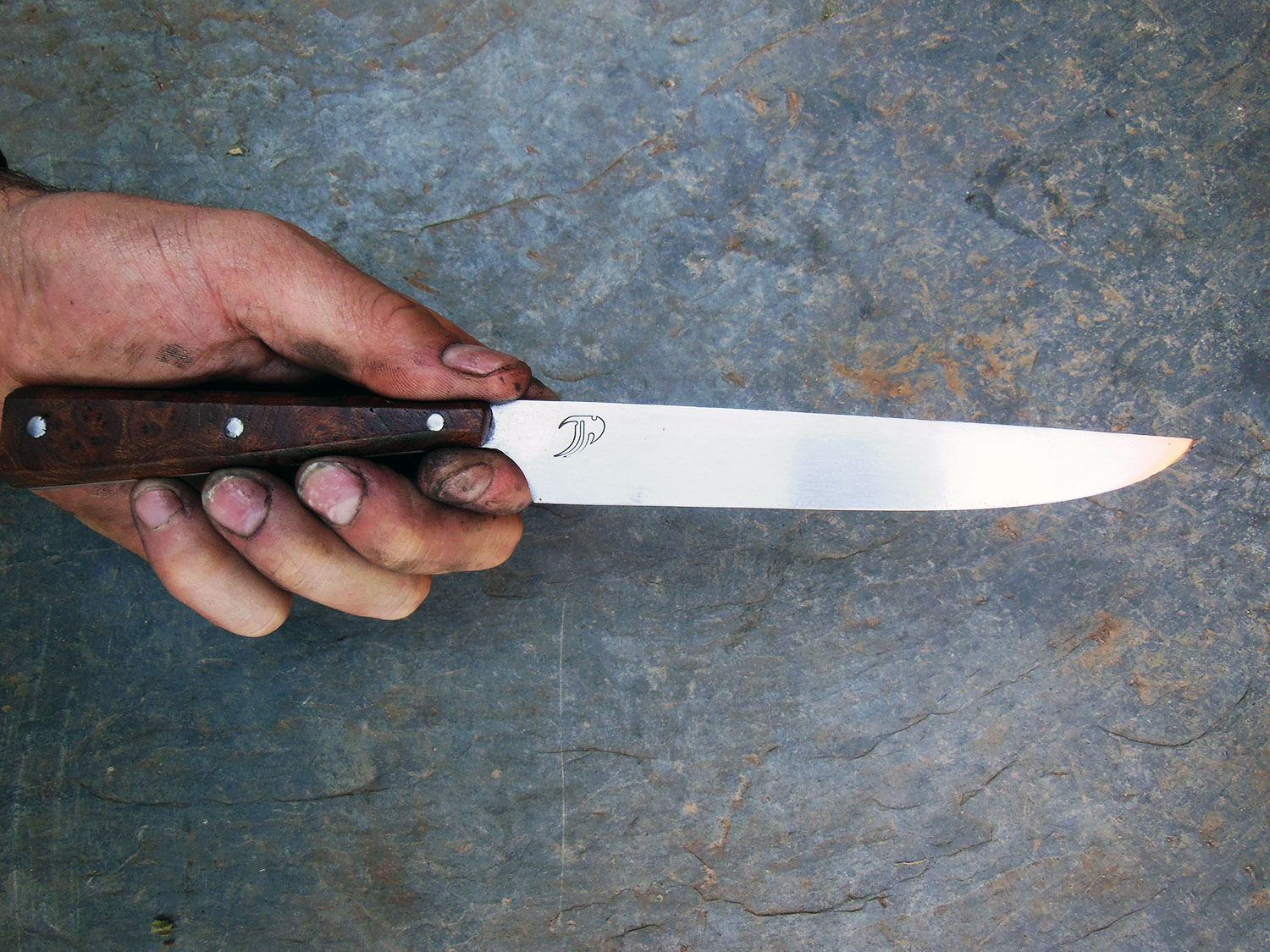 Manche en loupe d'orme (rare) 13.5cm - lame de 16cm forgée en acier XC90 - Epaisseur env 3mm - Rivets aciers.