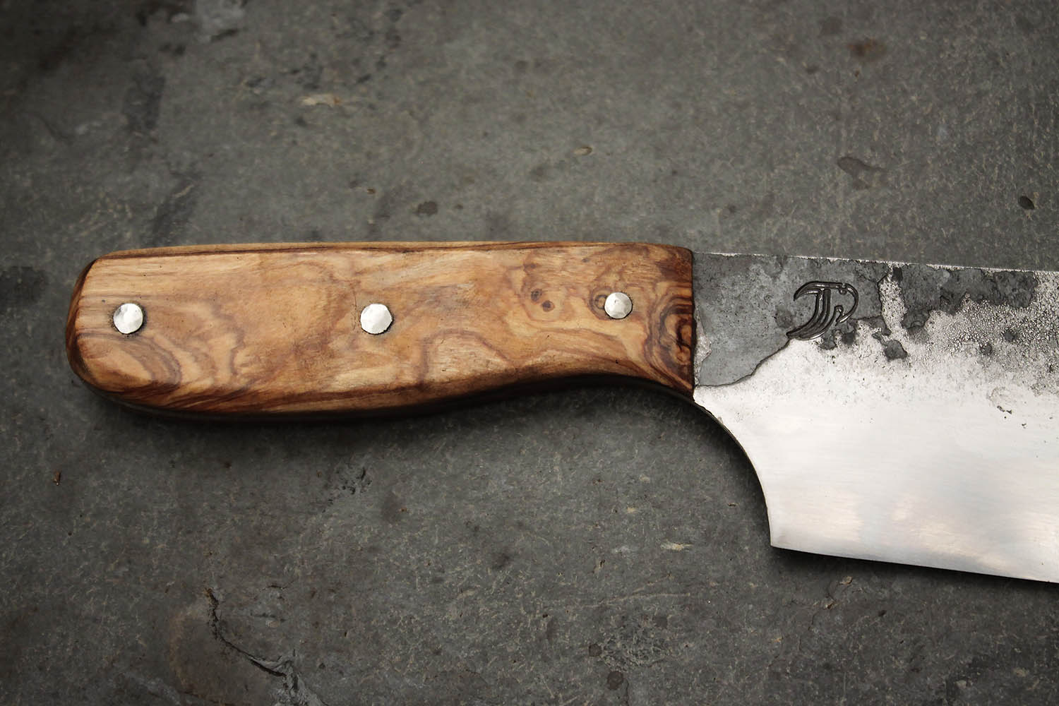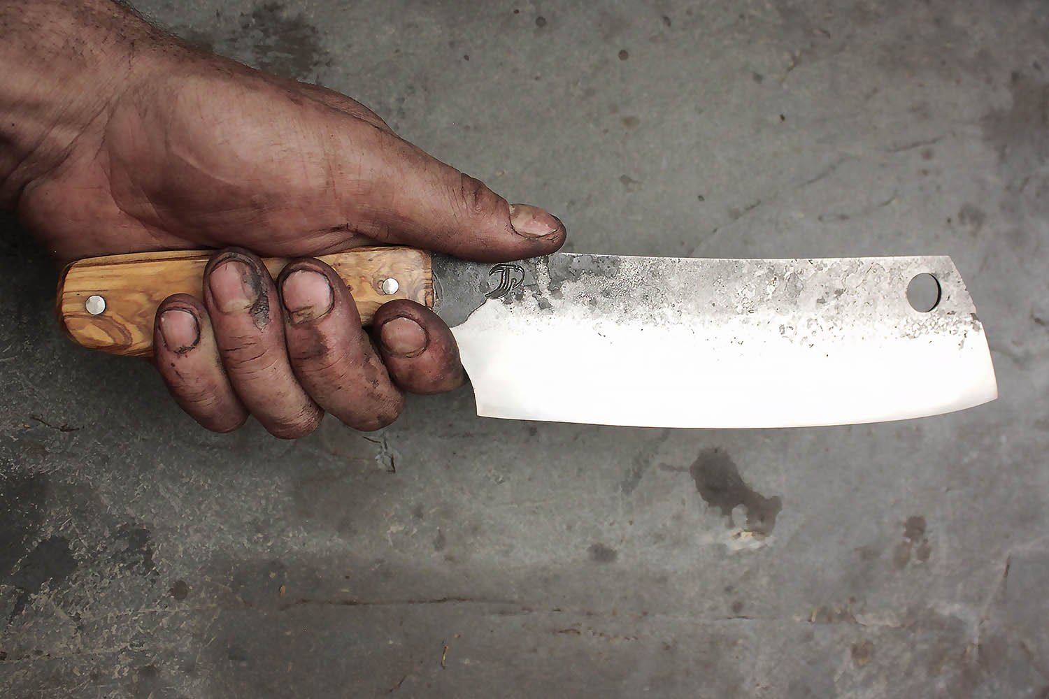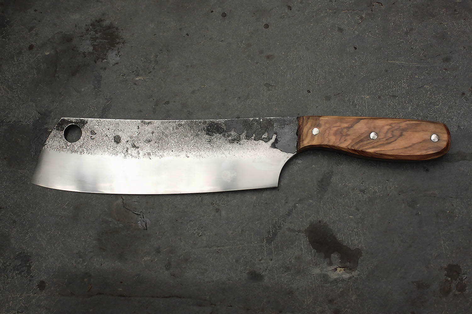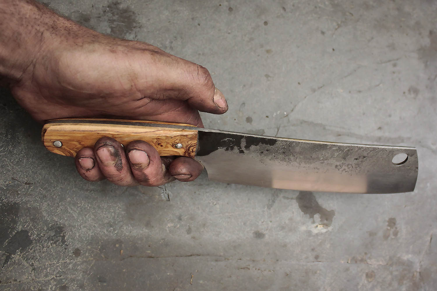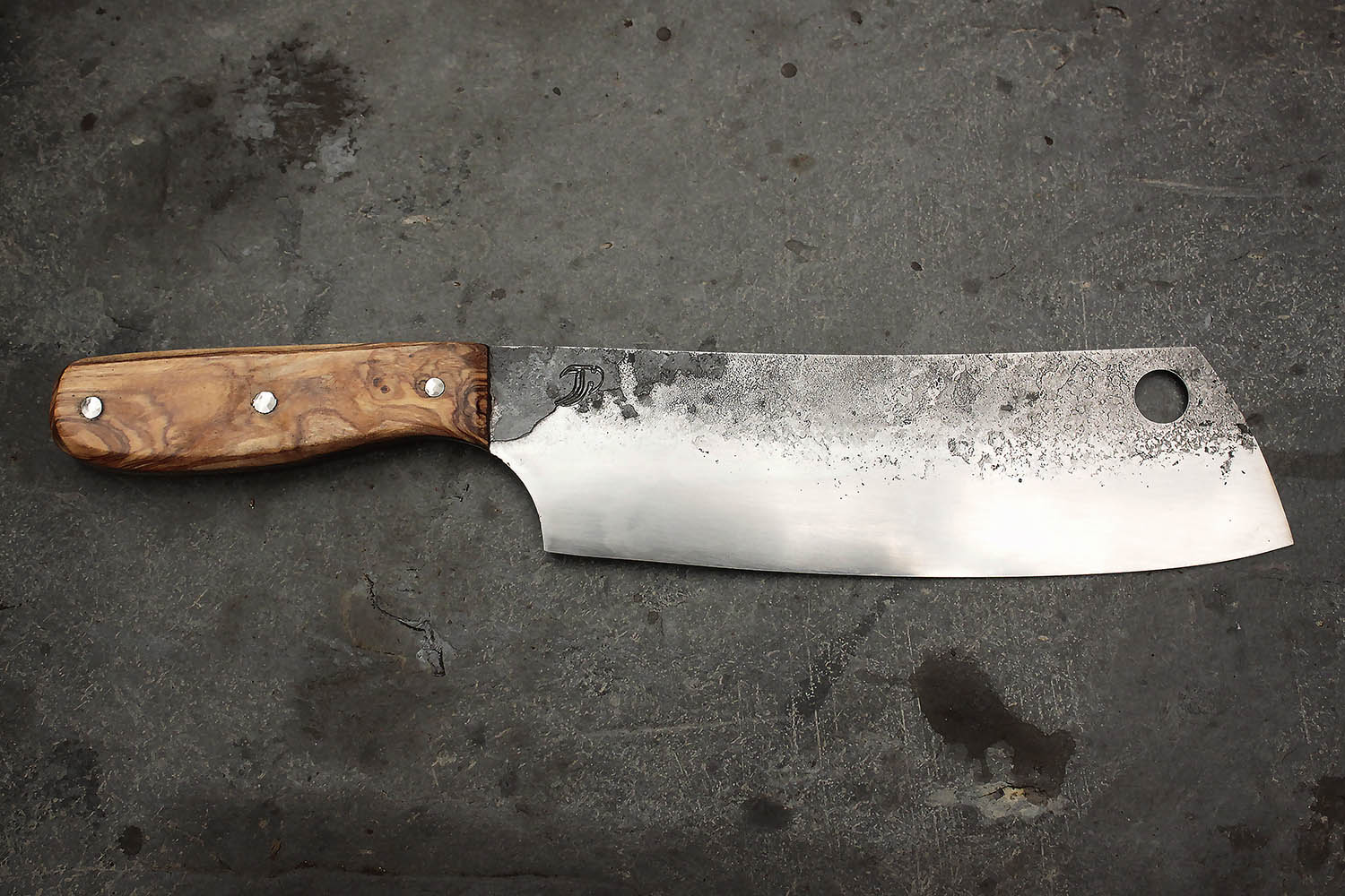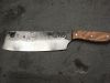 Hachoir forgé en XC100 et manche en Olivier. Lame de 18cm et manche de 12cm pour une prise courte. Montage sur rivet inox.