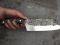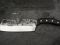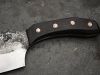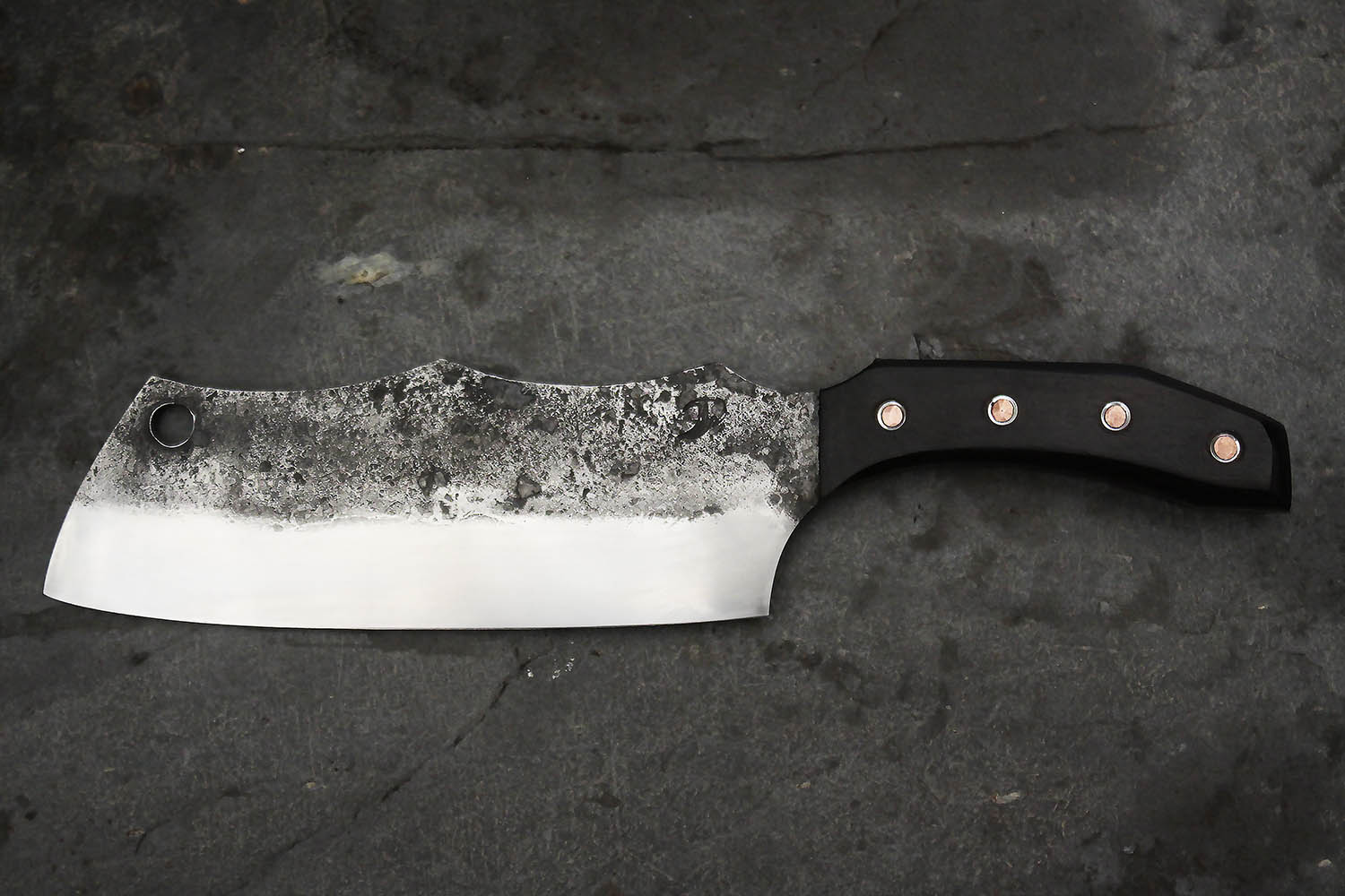 Très gros hachoir forgé avec lame de 18cm, manche de 14cm, hauteur de 7cm. Manche en ébène monté avec rivets cuivre sur rondelles inox. Acier XC100