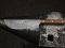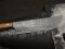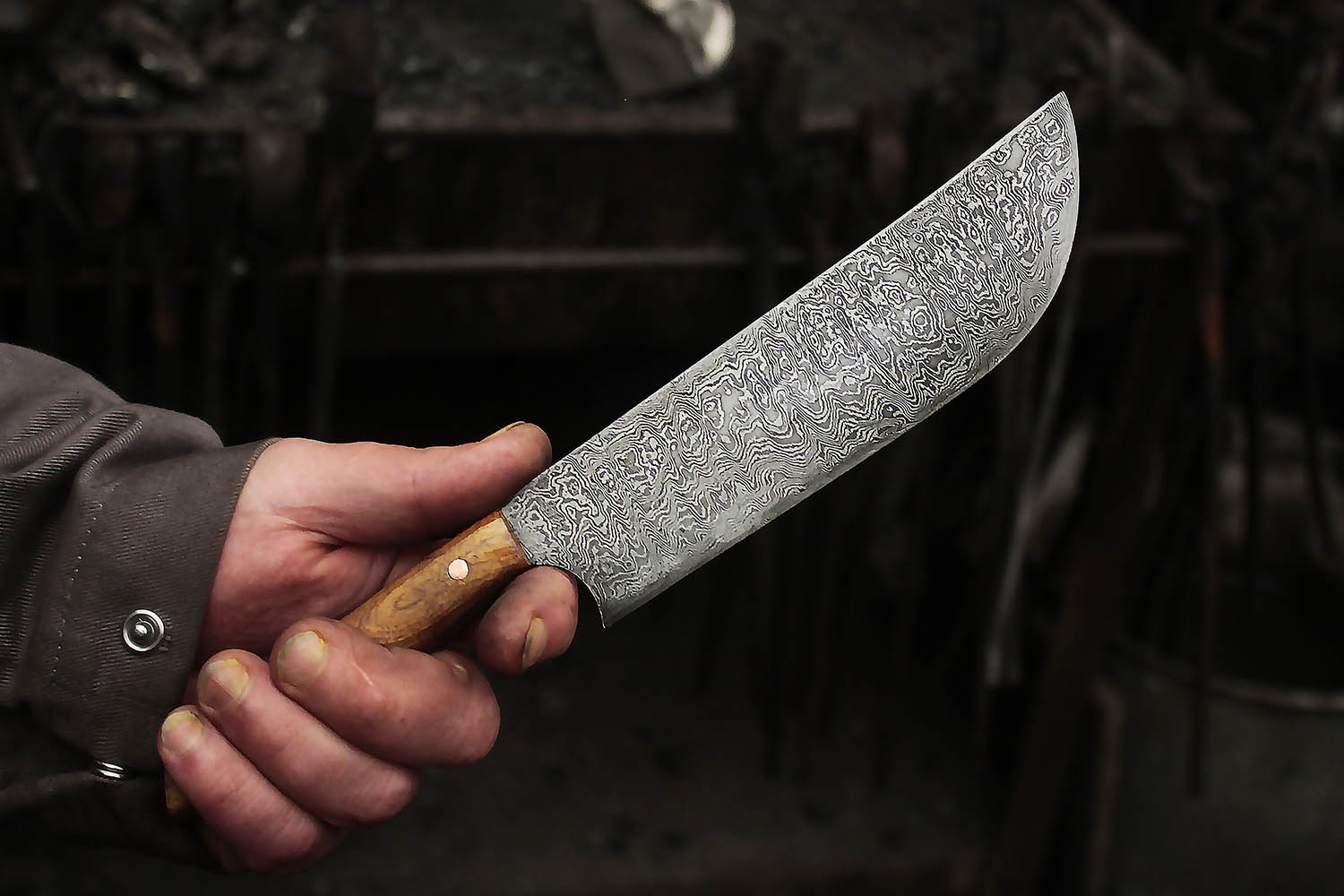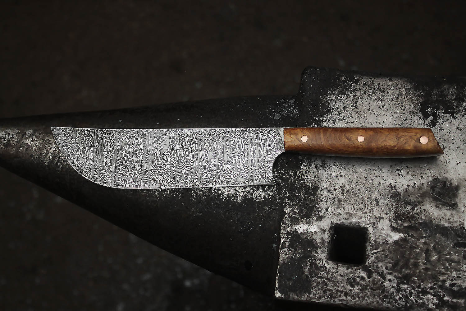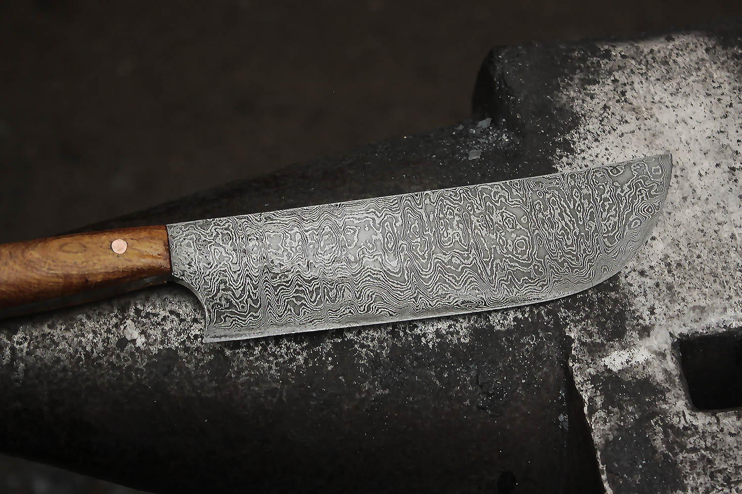 Couteau en acier feuilleté/damas de 224 couche en xc100 et 15n20. Manche en acacia. Rivet en cuivre.