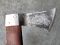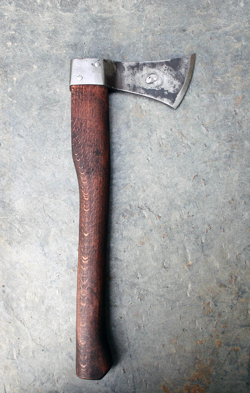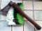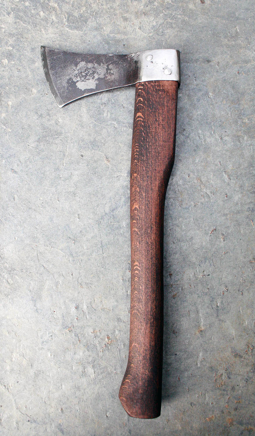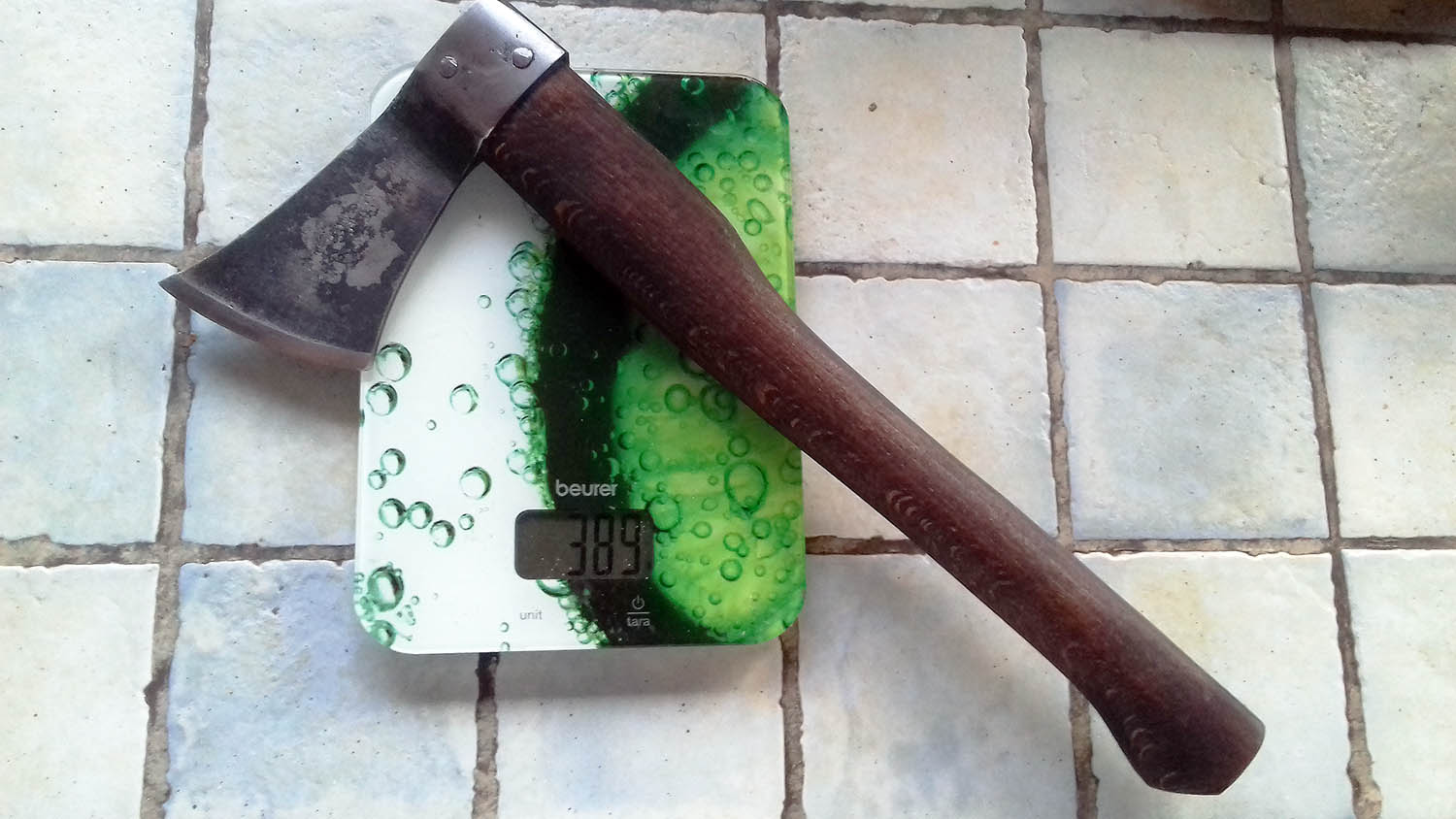 Hache de lancer en 54SiCr6 (acier à ressort) - 11cm de long - 5.5cm de tranchant - manche en fêne de 30cm. Poids : 389g