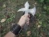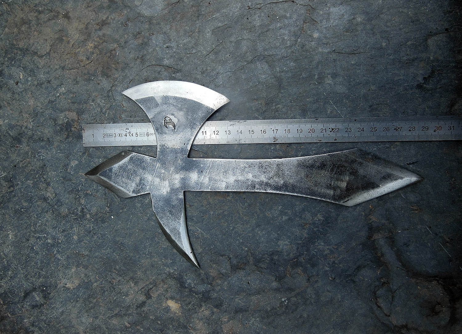Longueur totale 29cm - largeur 15cm - poids : 395g - acier XC60 (solide et facile à affûter) Impossible de rater sa cible :)