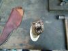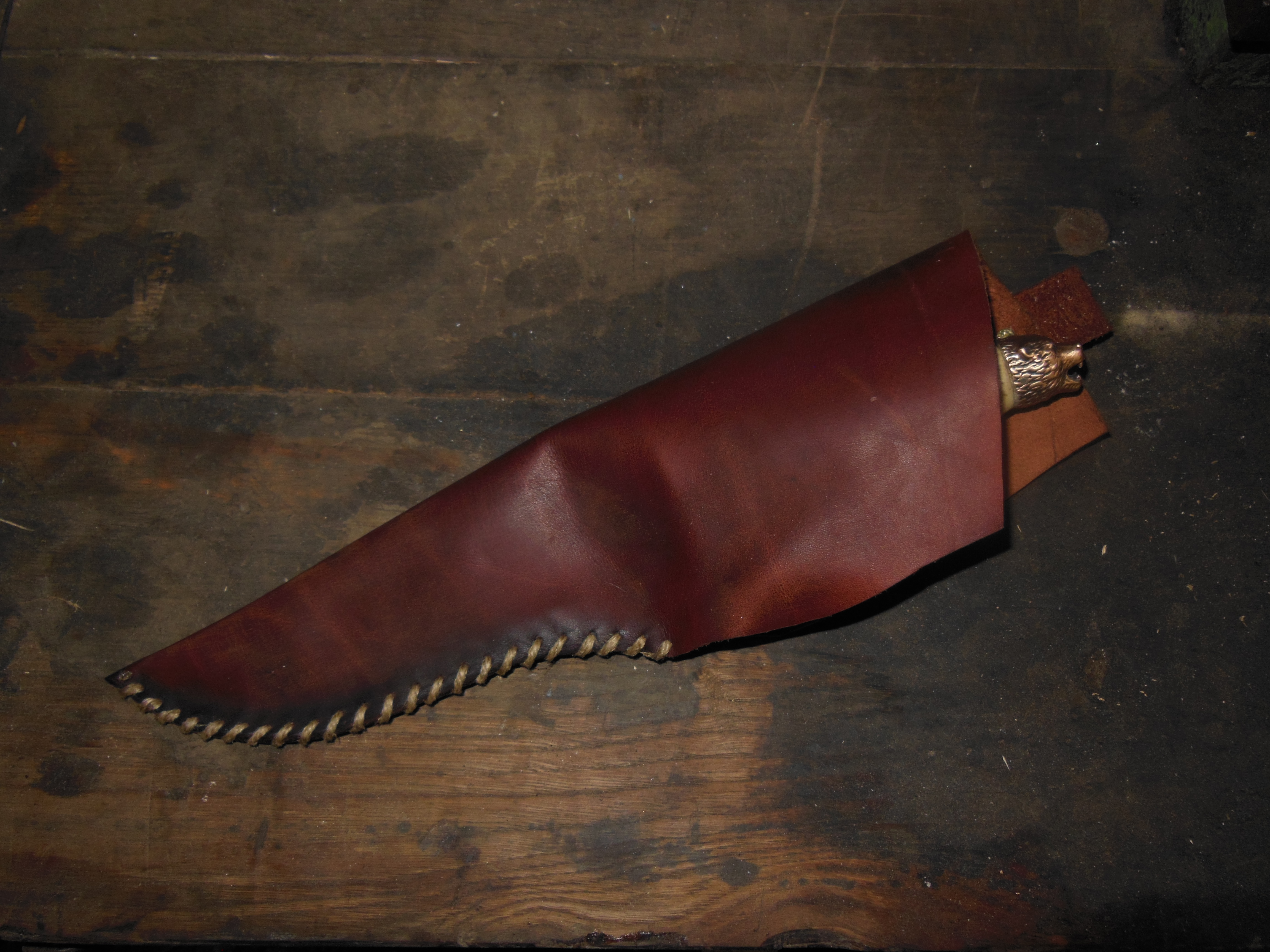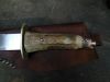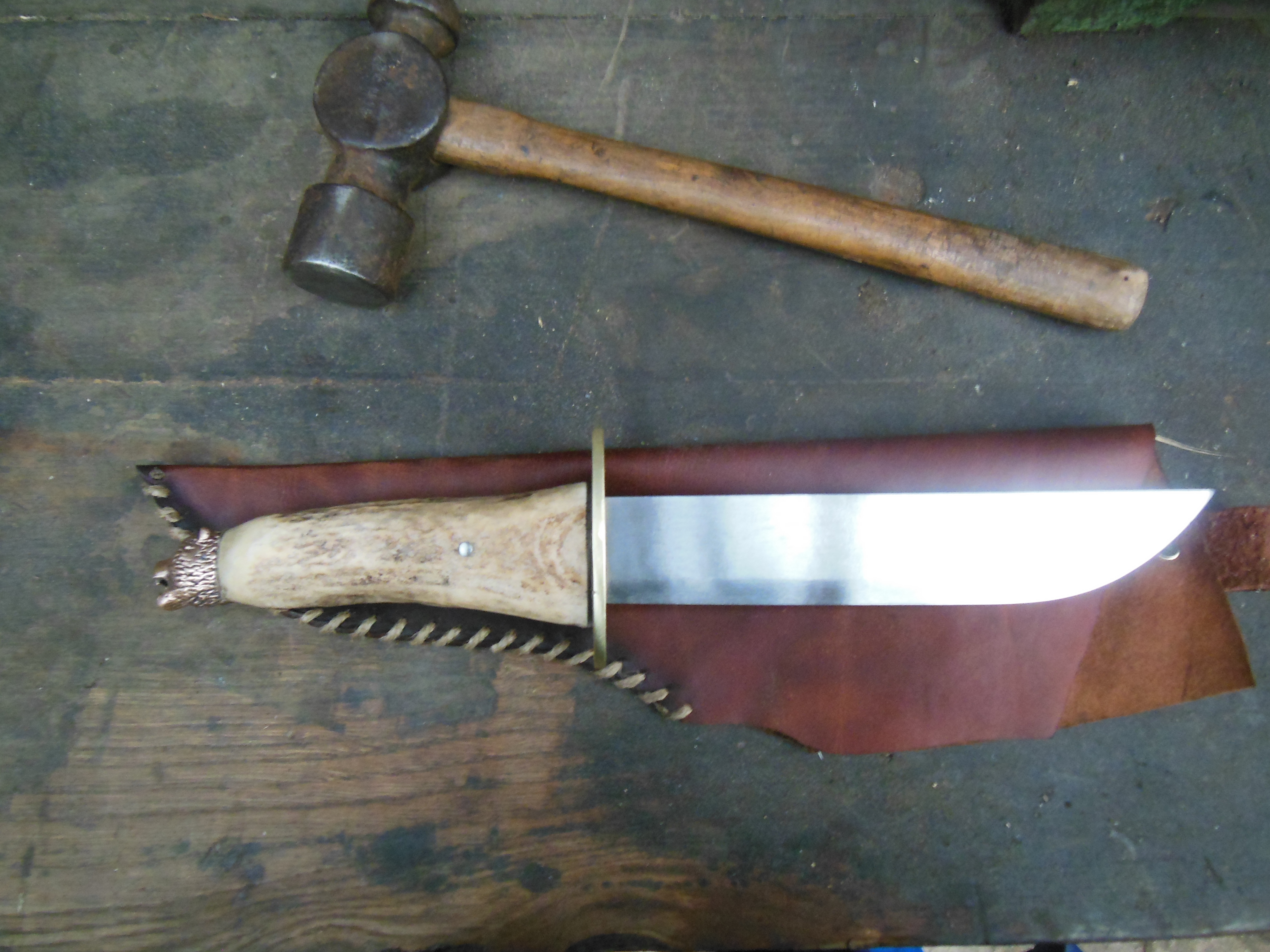 Couteau réalisé sur mesure pour mon pizzaiolo préféré. Lame de 21cm - Acier XC90 - manche de 13cm - Epaisseur 3.5mm au dos - Pommeau "Ours" en bronze moulé - manche en élan - garde en laiton.
