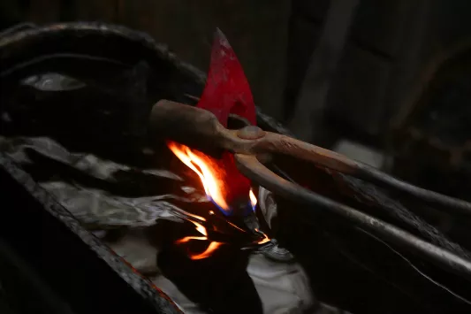Lorsque la forge de la hache est terminée, on passe au traitements thermiques : Recuit, Normalisation, Trempe, Revenu. A ce moment, la hache prend vraiment vie.