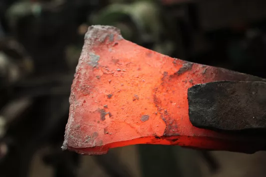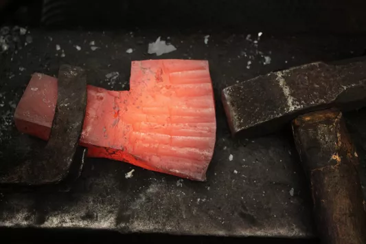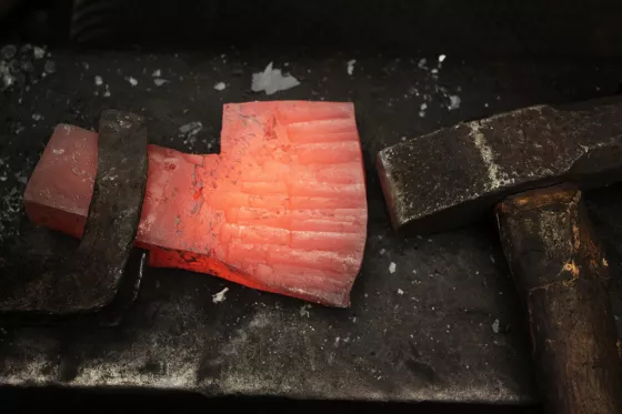 Une fois le perçage réalisé, il faut forger le corps et le tranchant de la hache. C'est la que la forme globale commence à apparaitre.