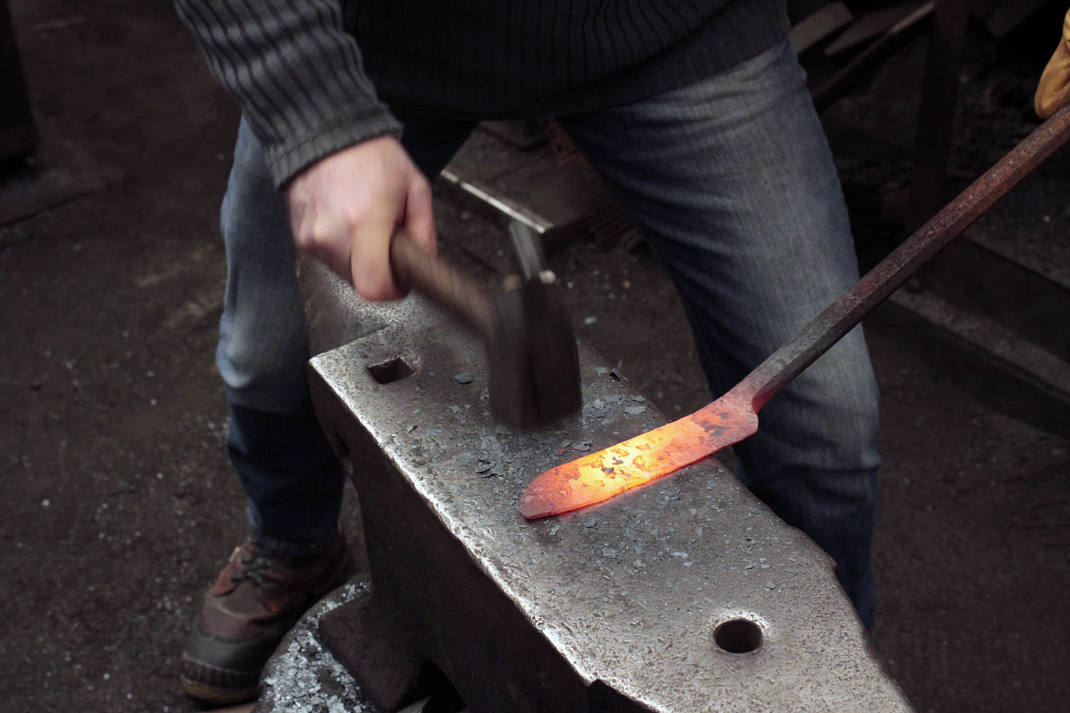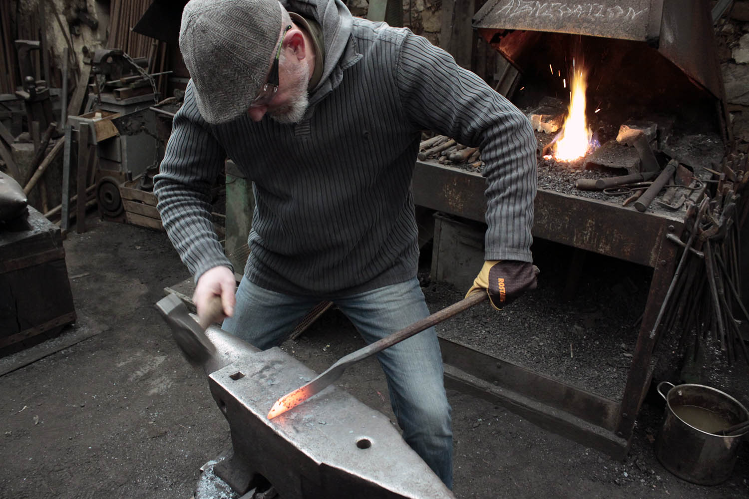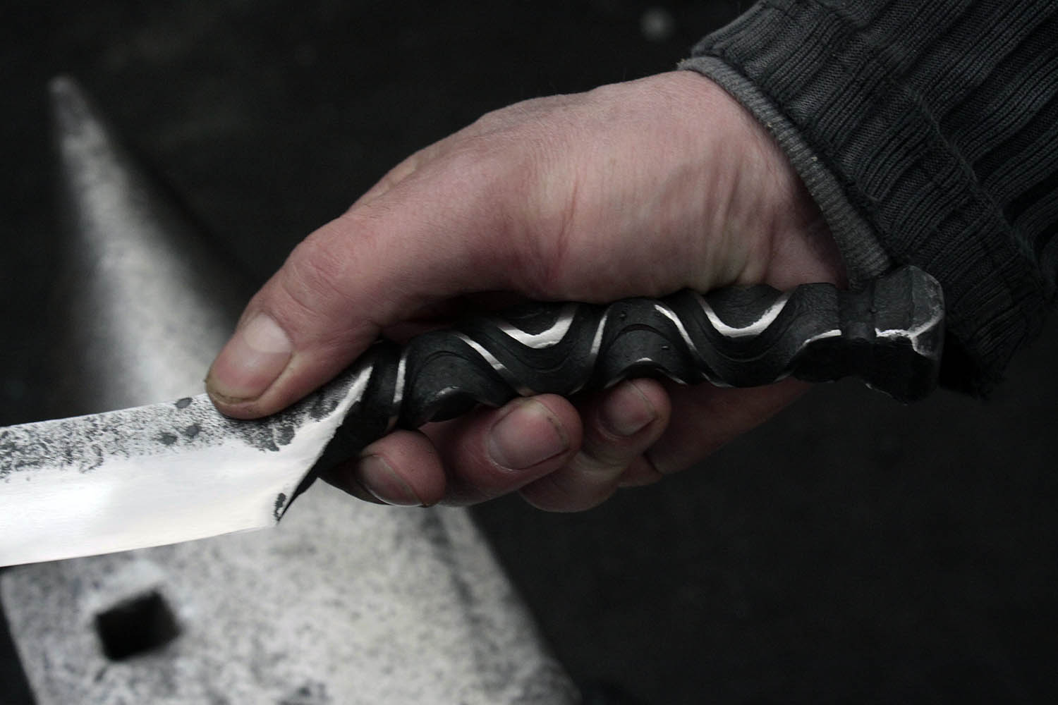 Passionné de reconstitution, de spectacle et d'équitation, ce jeune forgeron est venu faire son premier stage de forge pour réaliser ce gros couteau brut de forge.