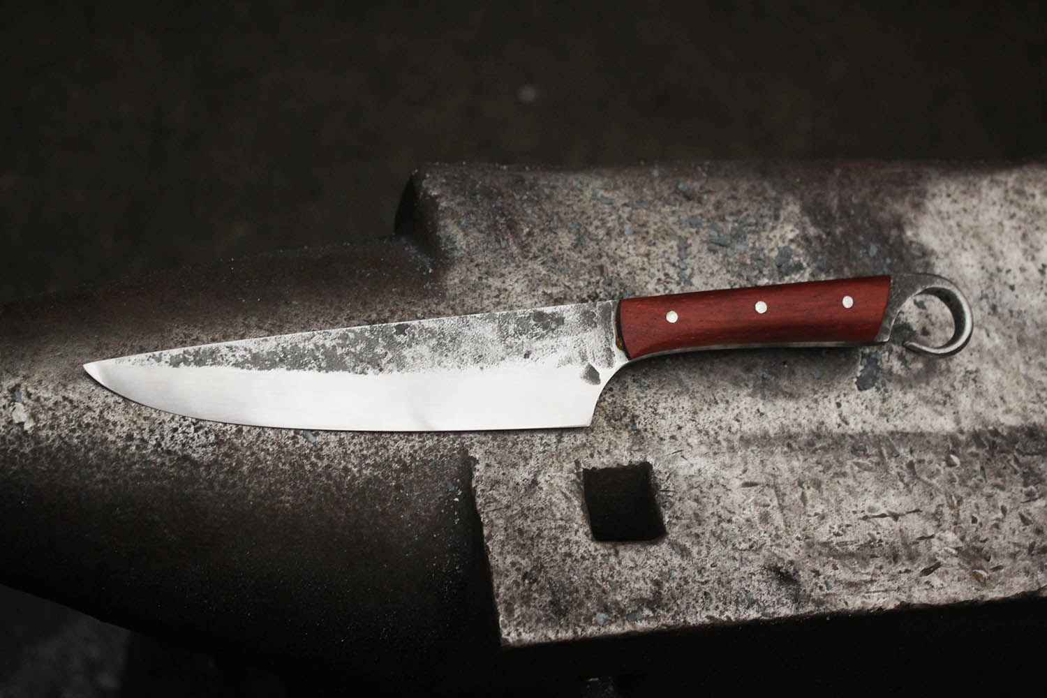 Medecine et forge, ca envoi ! Couteau brut de forge avec manche en padouk aux lignes terriblement agressives. Parfait pour ... un peu tout