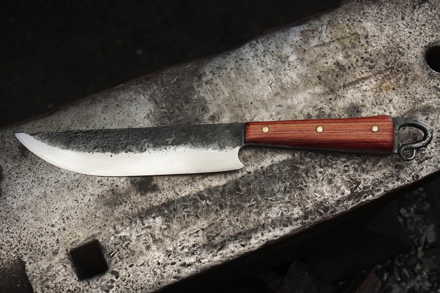 Manche en bois de rose, rivets laitons, et lame terriblement efficace. tout ce qu'il faut pour un bon stage de forge.