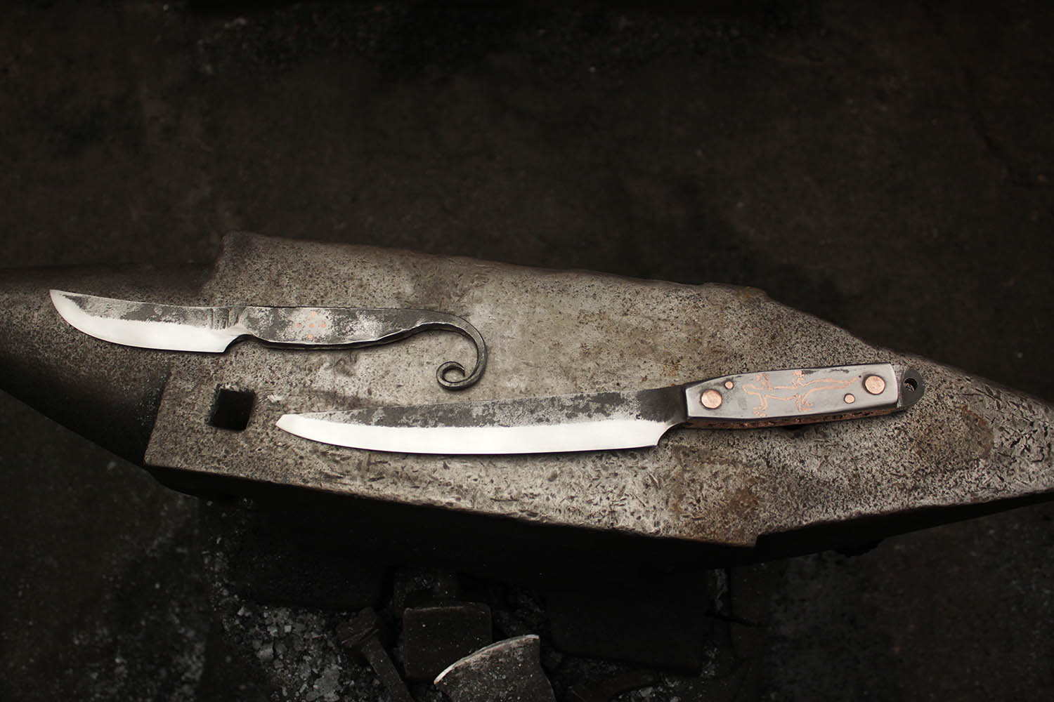 4 jours de stages pour Dominique. Voila de quoi se faire plaisir. Au programme, 2 couteaux forgés dont un très spéciale. Plaque acier et insert cuivre pour un rendu à la fois organique et metalique. vraiment un sacré travail.
