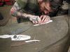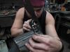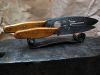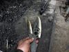 Pour son deuxième passage à la forge, mon ami tatoué est arrivé avec un projet complétement ouf. 2 couteaux avec manche bicolore (olivier et ébène) et lames sculptées. Il a fallu dépenser des trésors de technique pour évider et faire des angles bien net. car sculpter c'est bien, mais faire ca classe, c'est une autre paire de marteau. Très technique mais tellement classe.