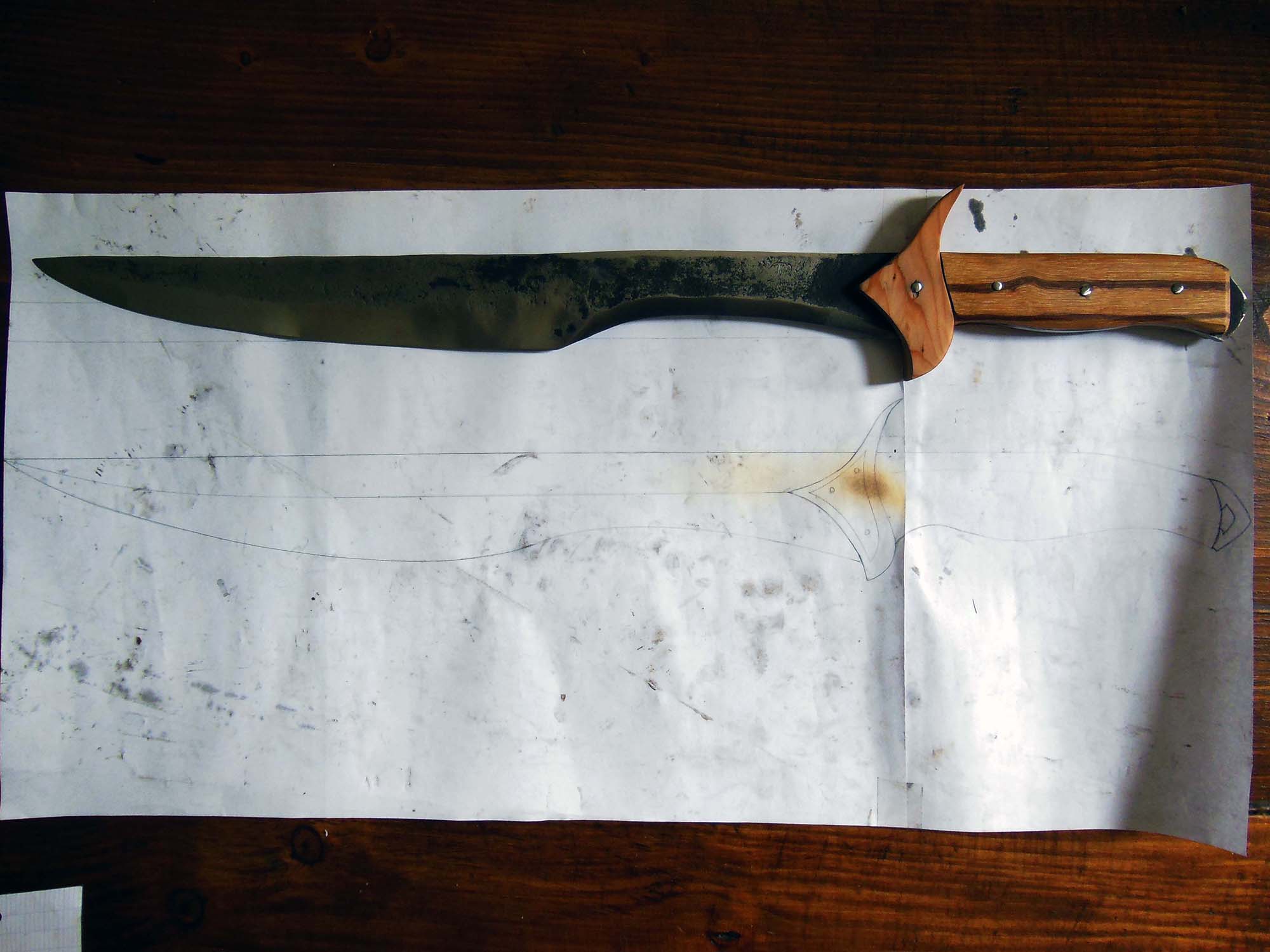 2 amis de longue date, une paire de treillis et de rangers pour 2 lames sur mesure. Matthieu s'est fait un énorme couteau brute de forge et Sebastien lui une très longue lame avec garde sculptée sur un design général basé sur Orcrist, "le fendoir à Goblin" de Bilbo le Hobbit ! Super cool de travailler sur des dessins précis !
