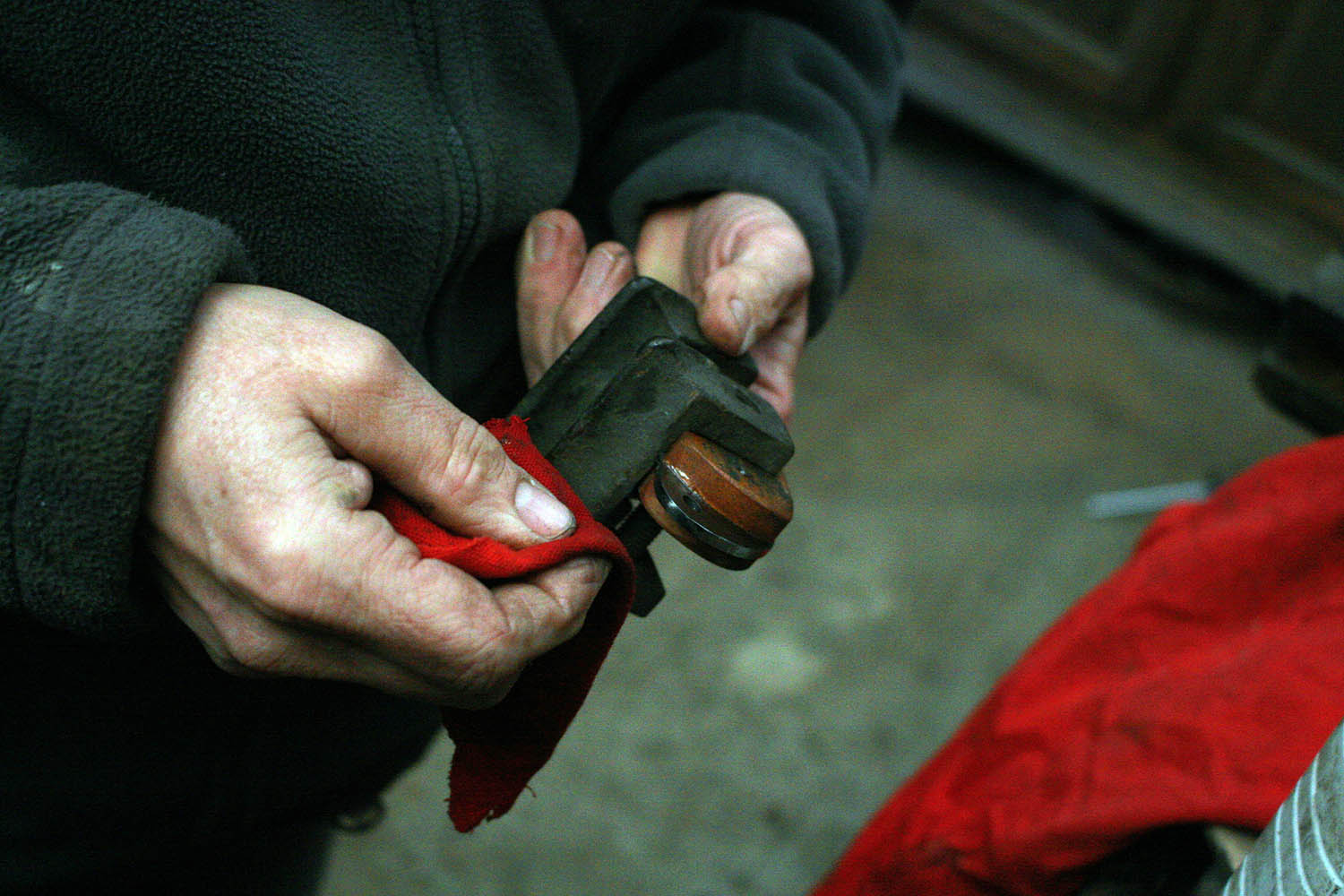 Passionné par l'artisanat, Nicolas est venu essayer la forge un peu comme un défi personnel. C'est lui qui a finalisé le manche et réalisé l'étui de son couteau. Bien joué camarade