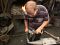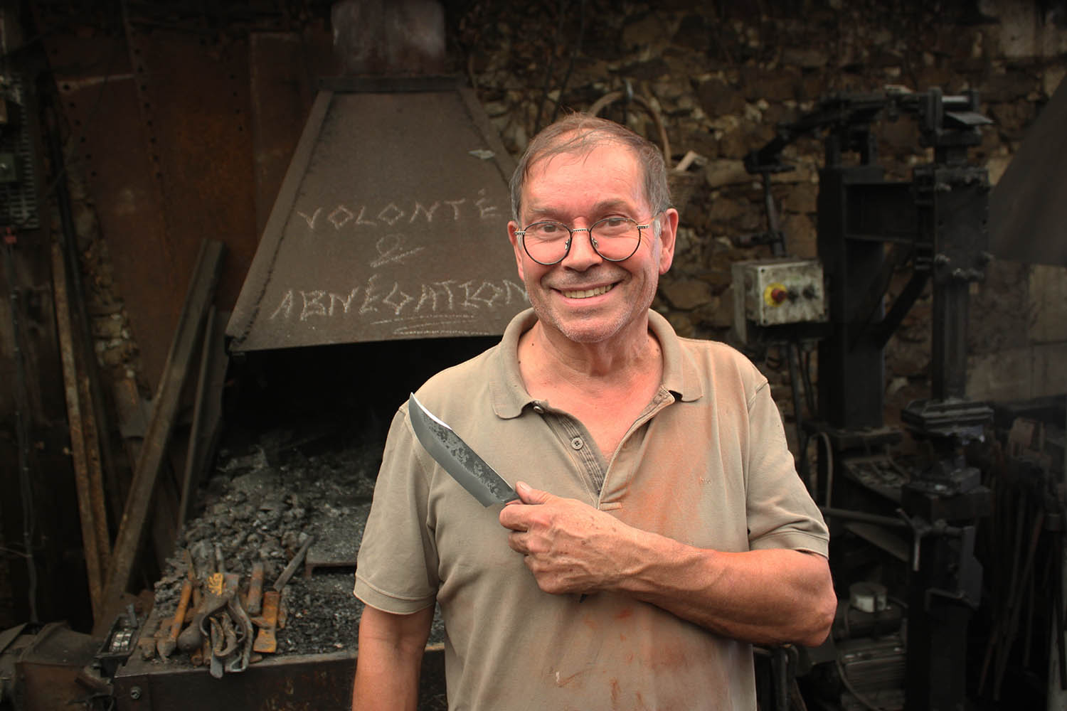Phillipe a été invité par d'ancien stagiaire pour venir à son tour cogner un peu sur les enclumes. Superbe couteau forgé avec manche en padouk.