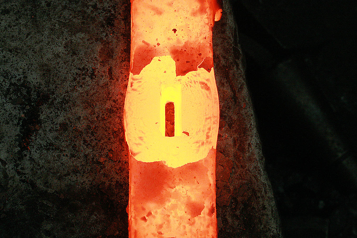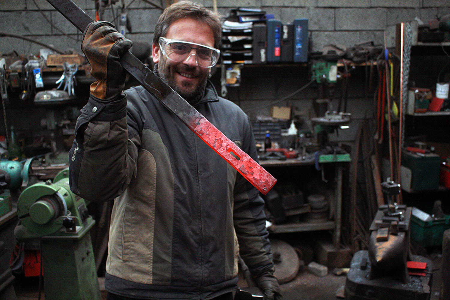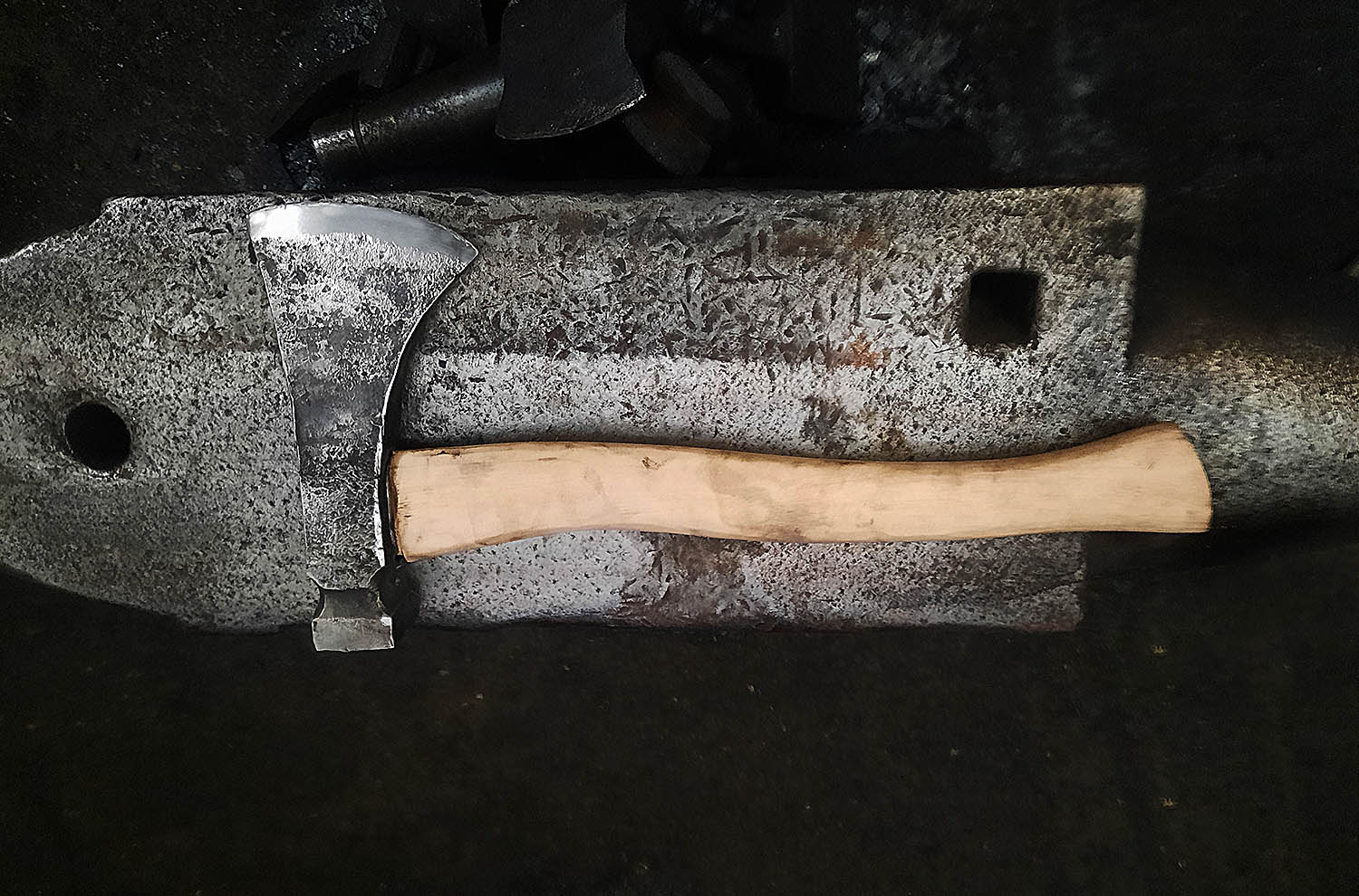 Julien ne voulais pas faire de couteau ! Alors on a fait une hache, c'est toujours bien une hache. Corps en C38, insert au tranchant en C130 et marteau en C45.