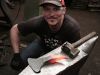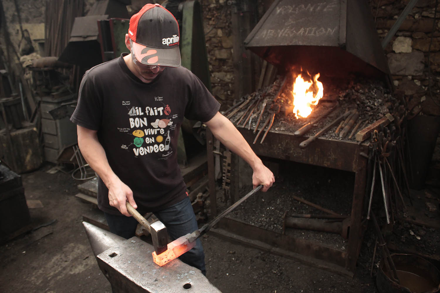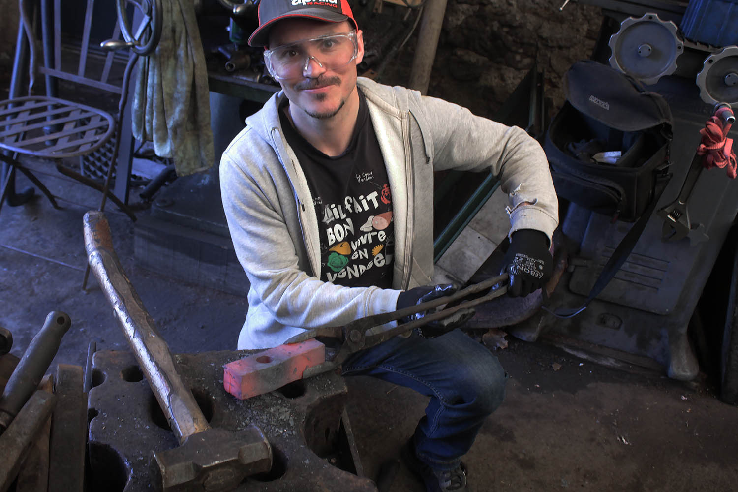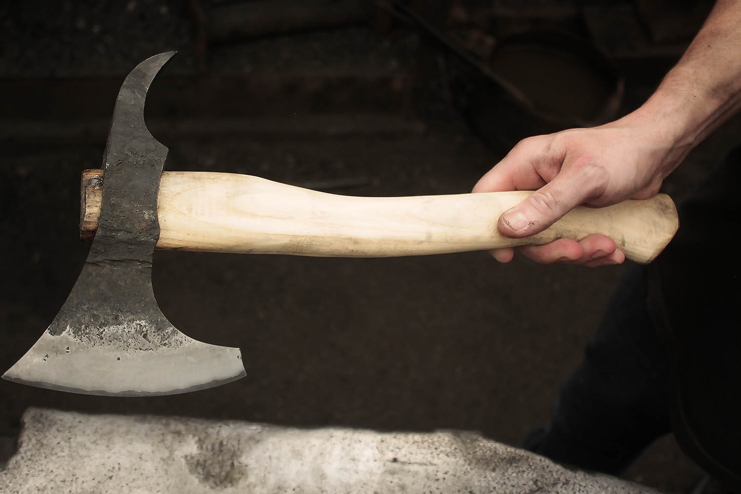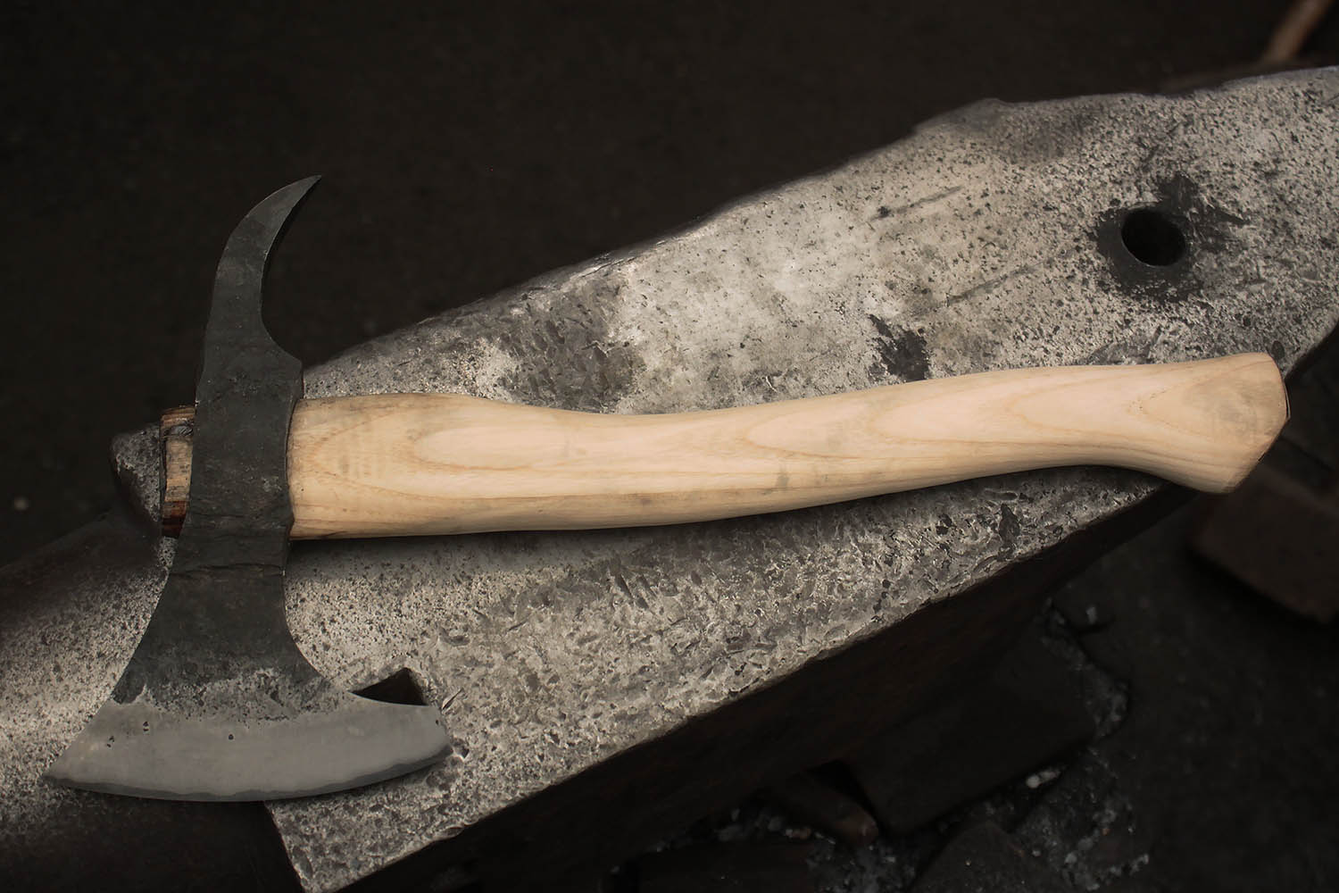 Pierre a bravé le feu et l'acier pour venir forger sa hache avec âme en XC100 soudé au feu. Parfaite et avec une ligne atypique. Bien joué.