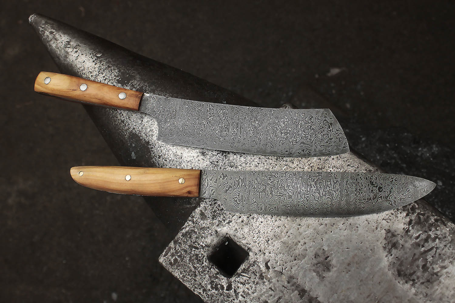 Ces 2 compères sont déjà passés 3x à la forge. Ce coup ci, ils ont œuvré 4 jours pour forger ces 2 magnifiques couteaux en damas avec manche en pommier. Un sacré boulot. Bien joué les gars, vous avez assuré.