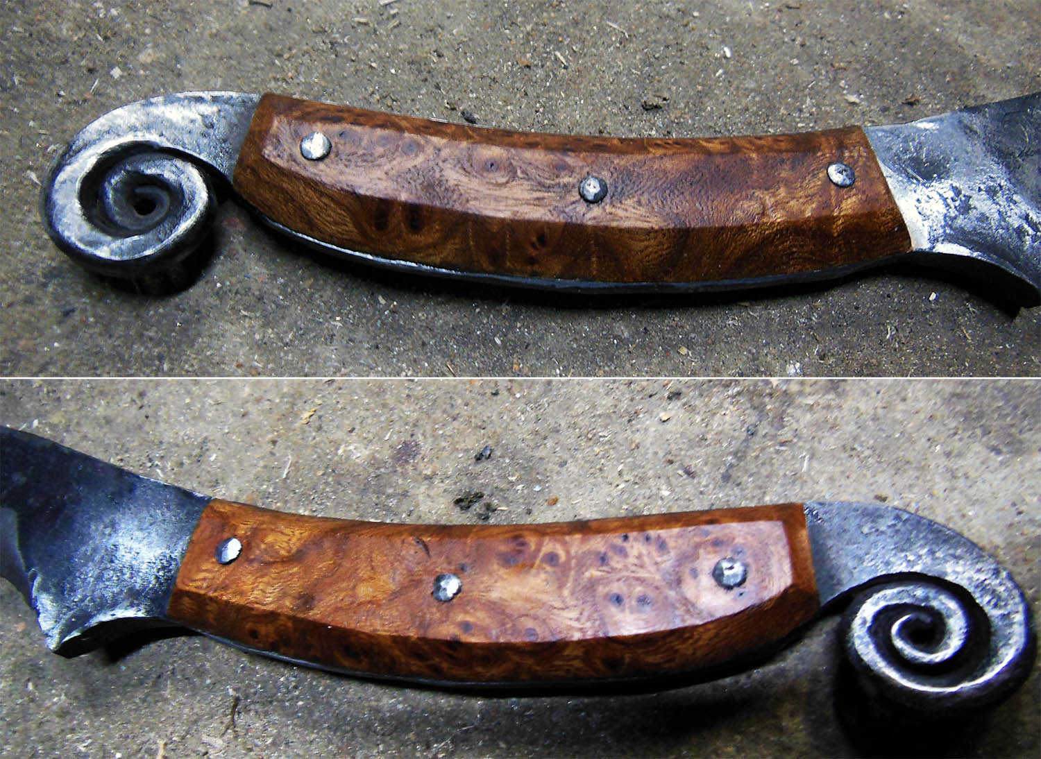 Longueur totale environ 35cm - Acier XC90 - manche en loupe d'orme - rivets acier Epaisseur env 4mm au dos.