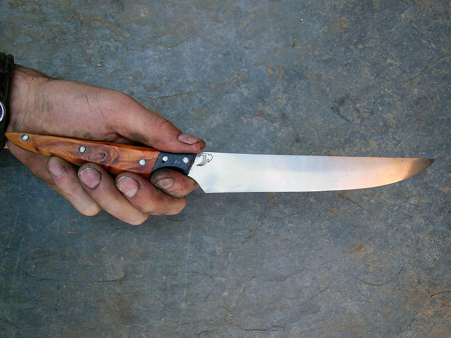 Manche de 13cm en duo d'if et d'ébène - lame de 16.5cm forgée en acier XC80 - Epaisseur env 3mm - Rivets aciers.