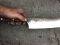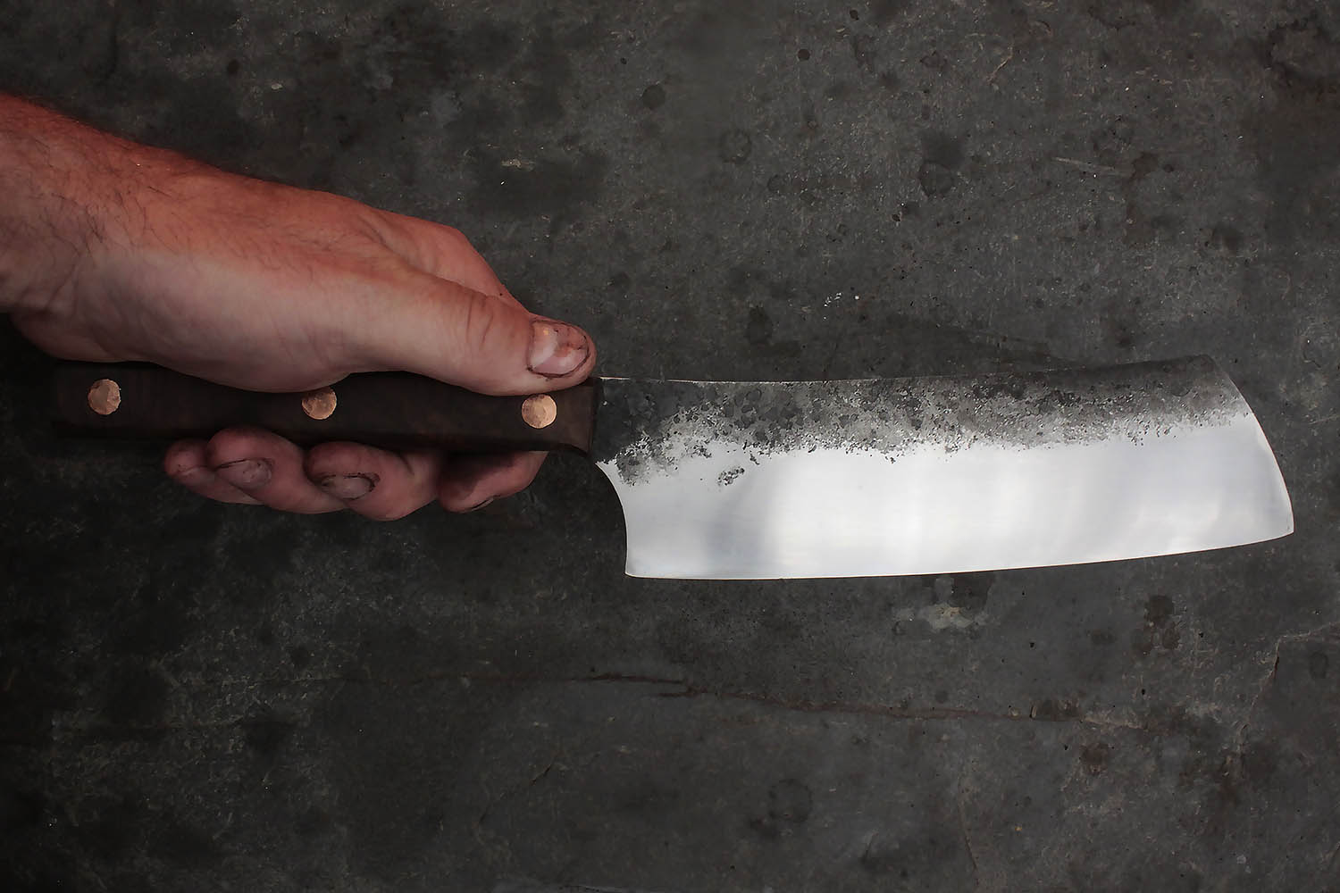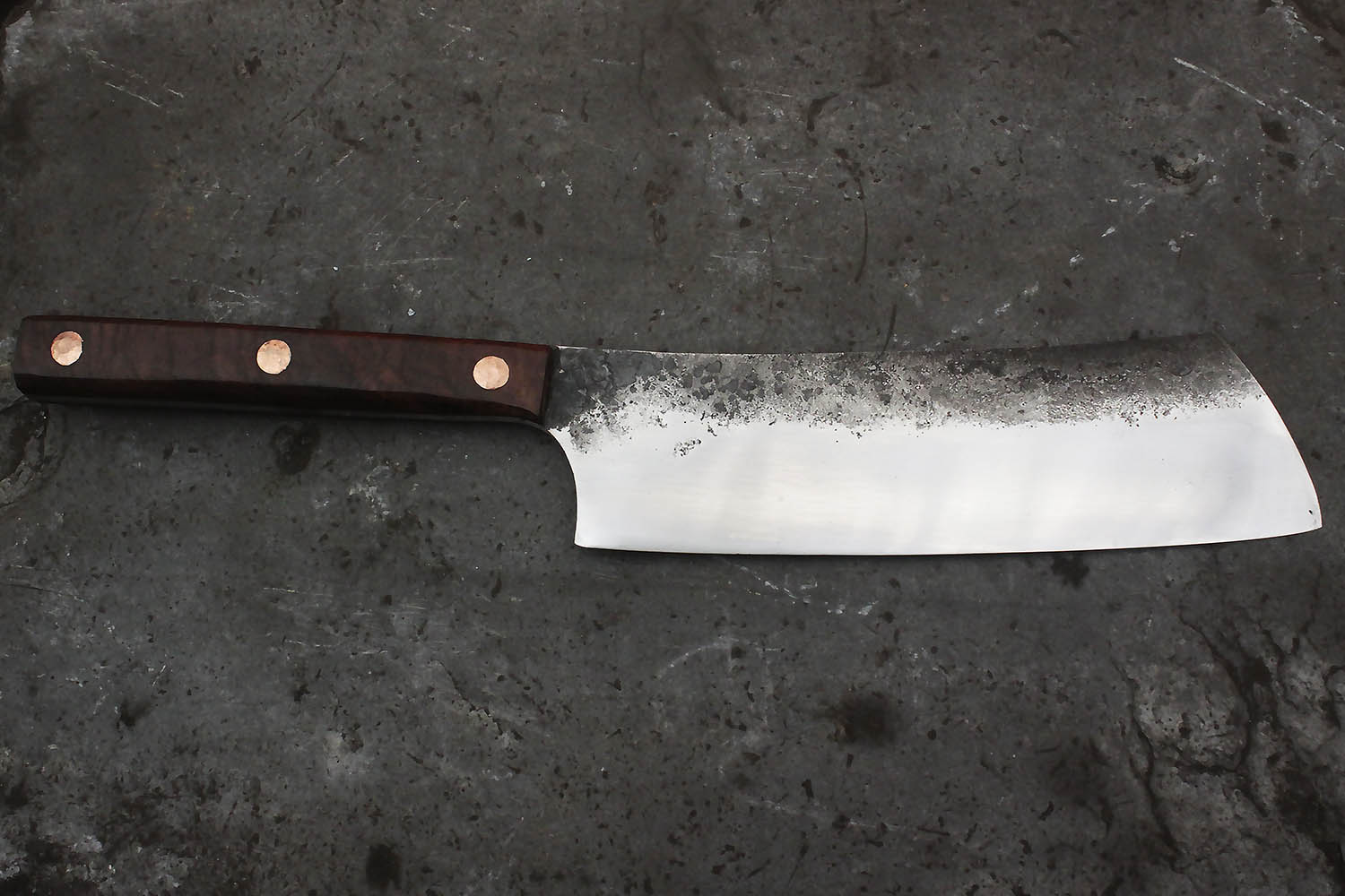 Hachoir forgé avec lame de 20cm, manche de 15 et bois de noyer. Hauteur de 6cm. Montage sur rivet cuivre. Acier XC100.