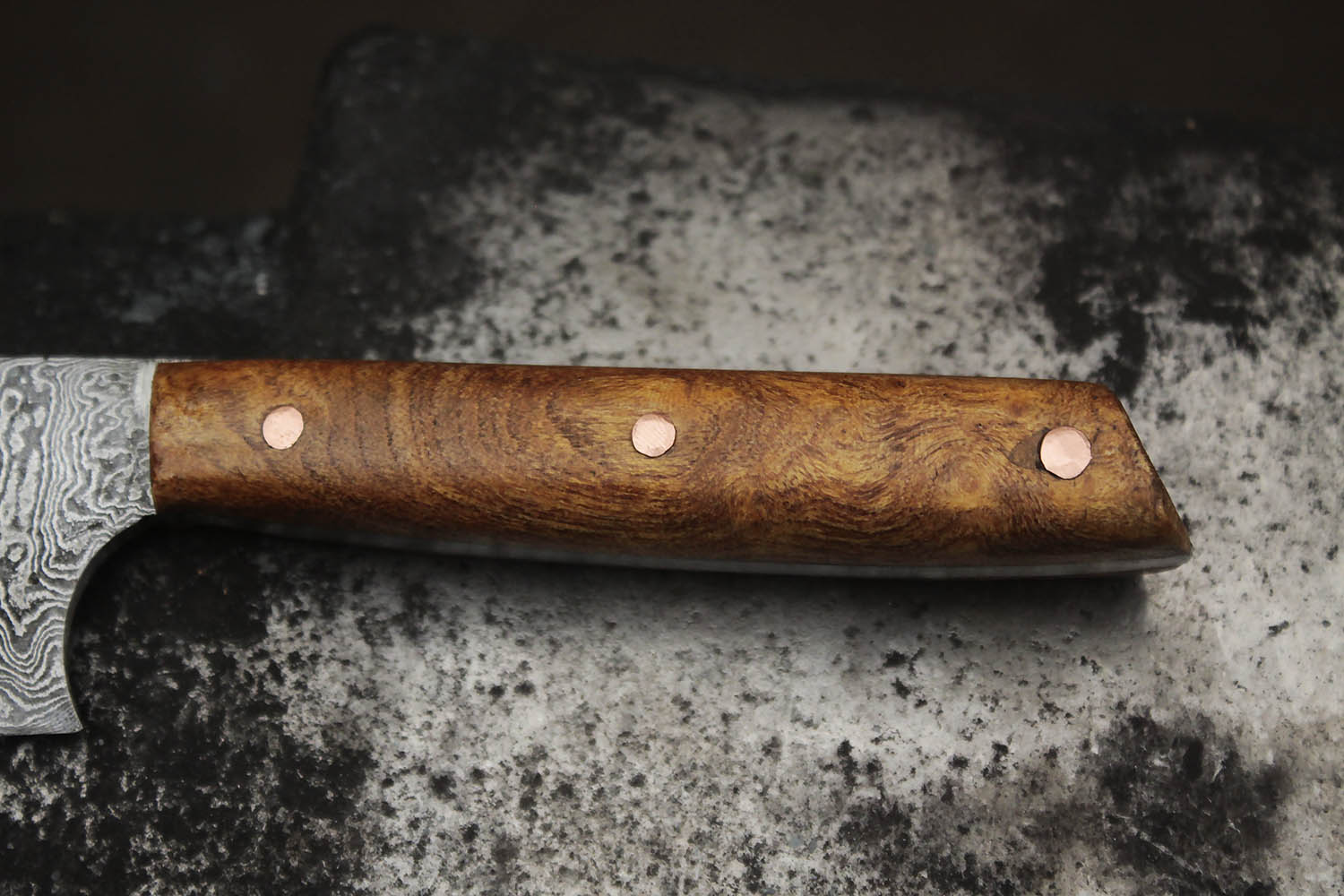 Couteau en acier feuilleté/damas de 224 couche en xc100 et 15n20. Manche en acacia. Rivet en cuivre.