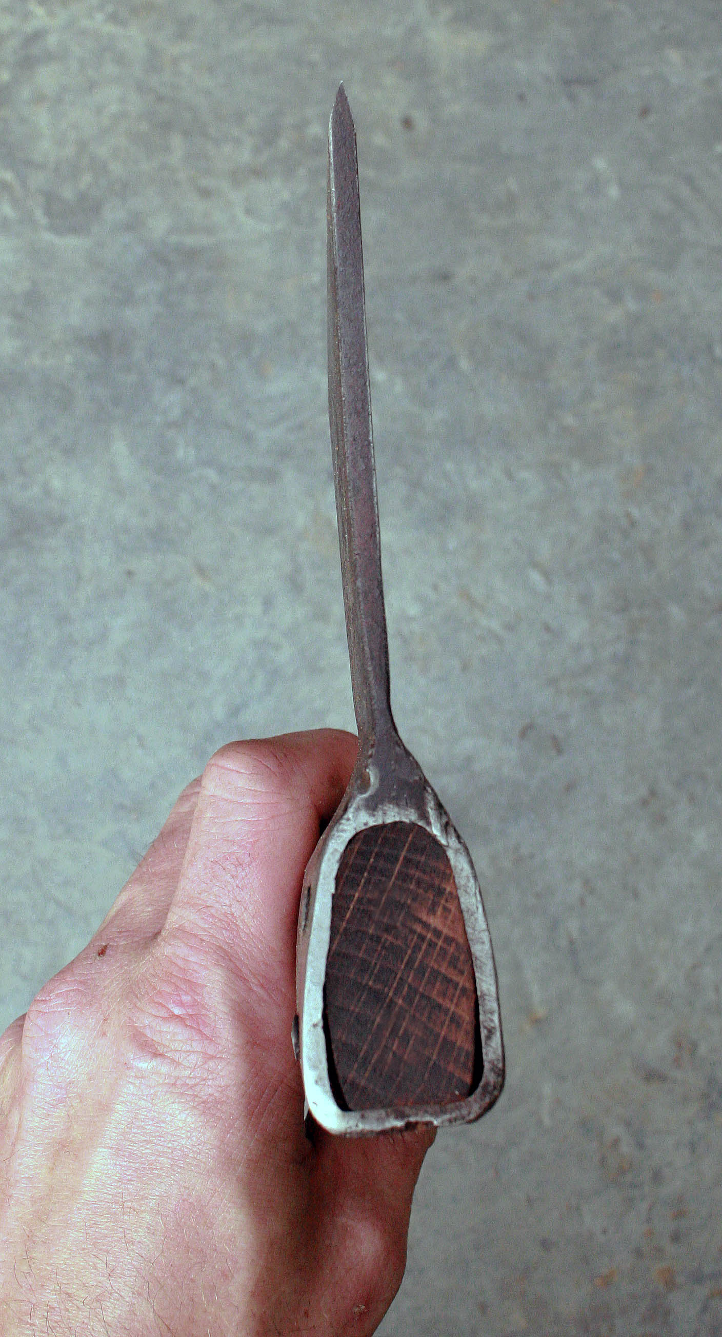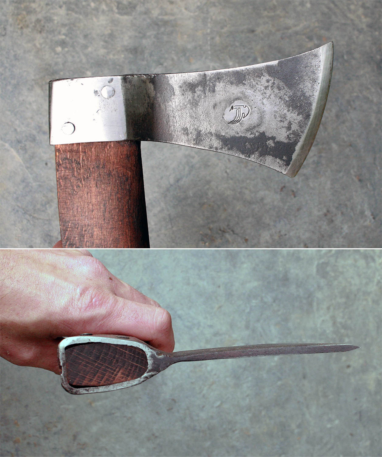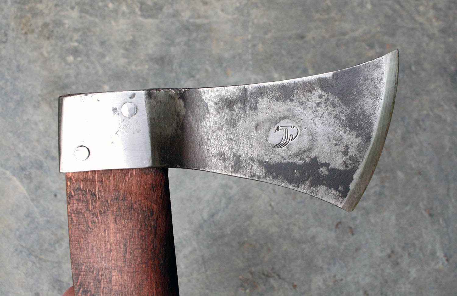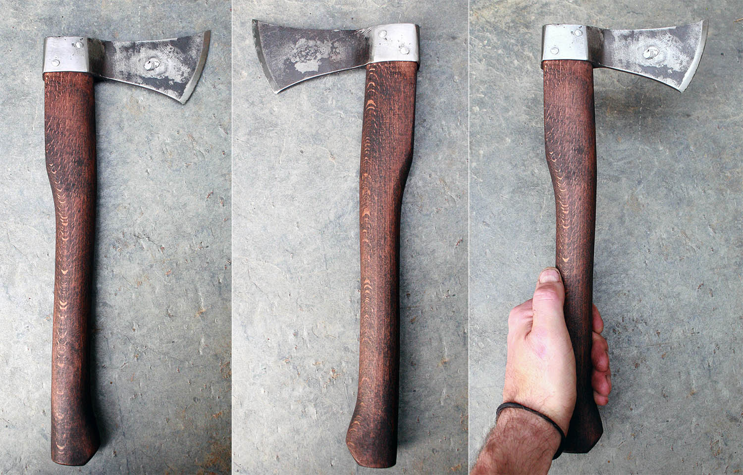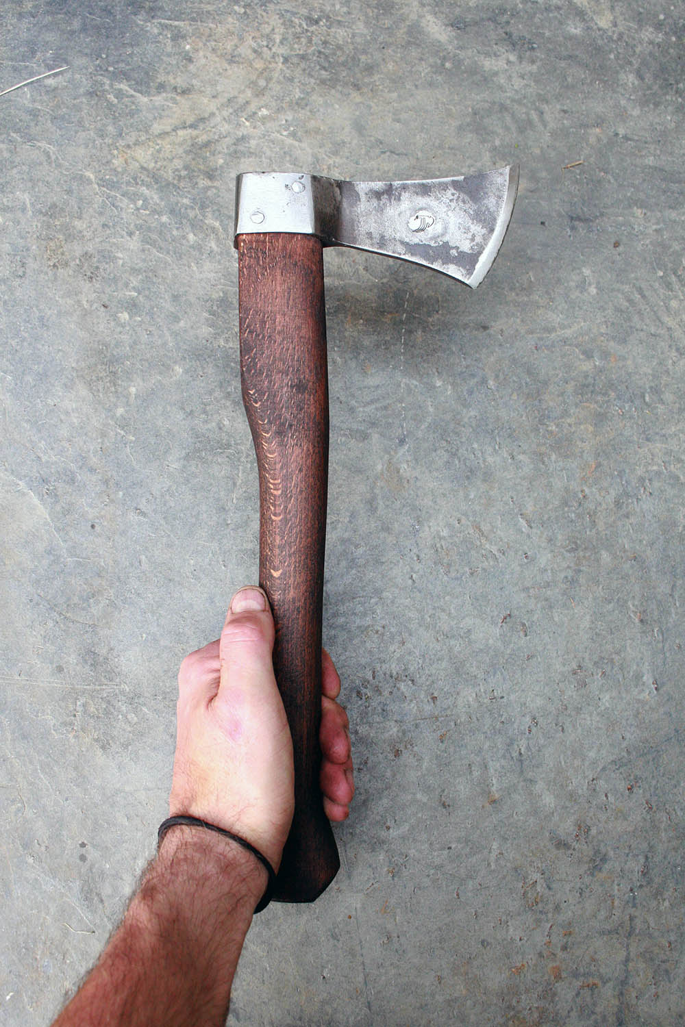 Hache de lancer en 54SiCr6 (acier à ressort) - 11cm de long - 5.5cm de tranchant - manche en fêne de 30cm. Poids : 389g