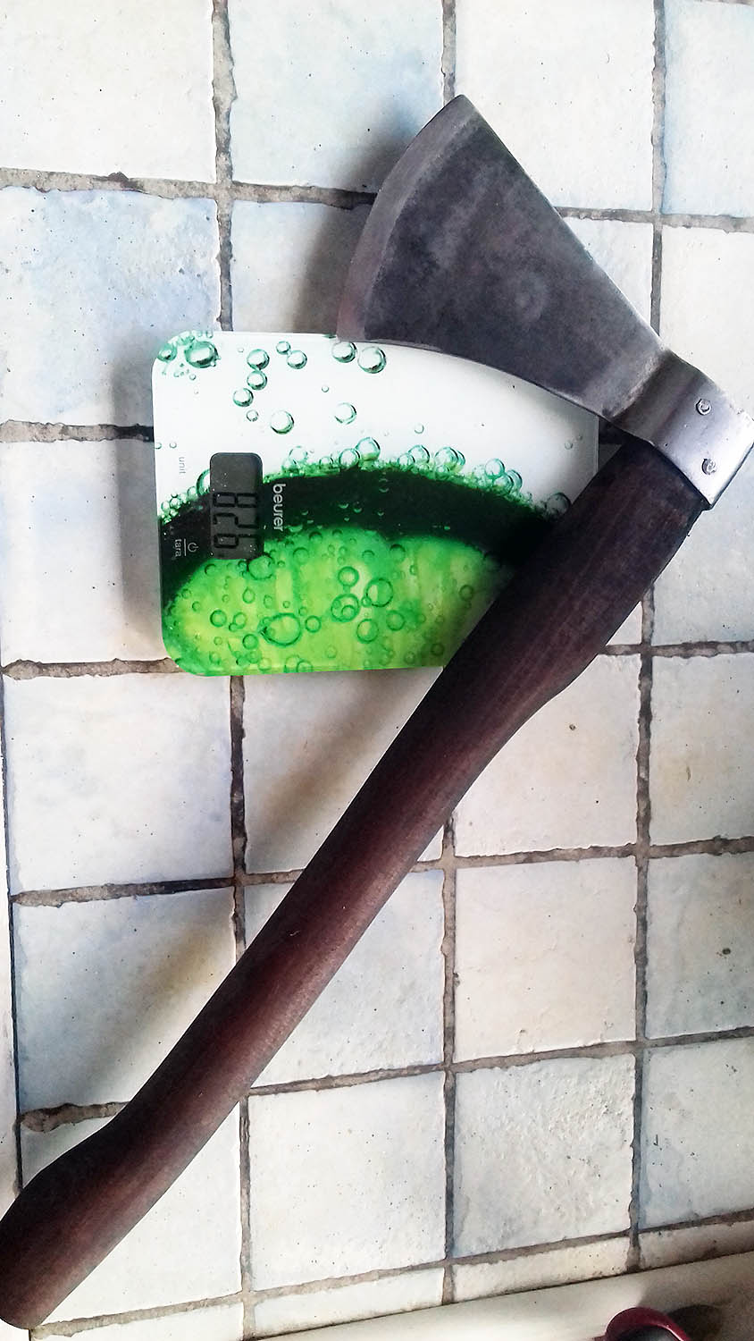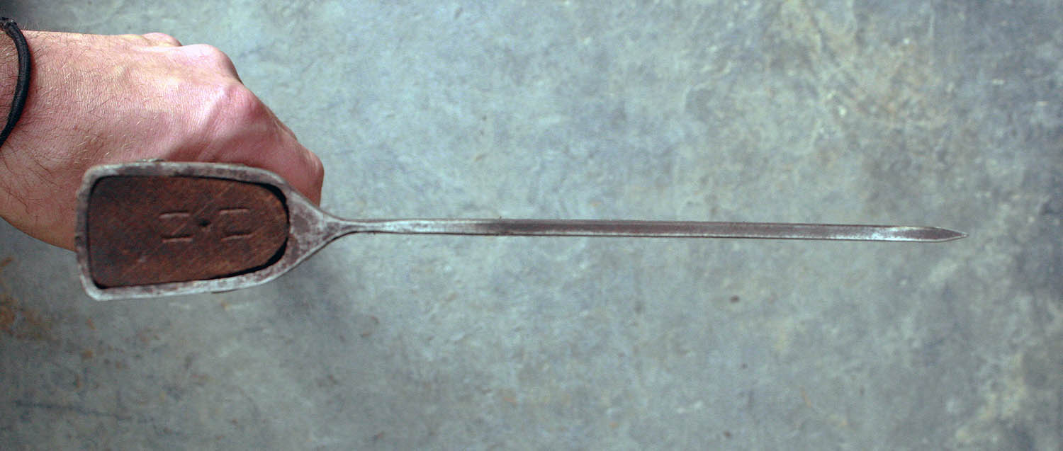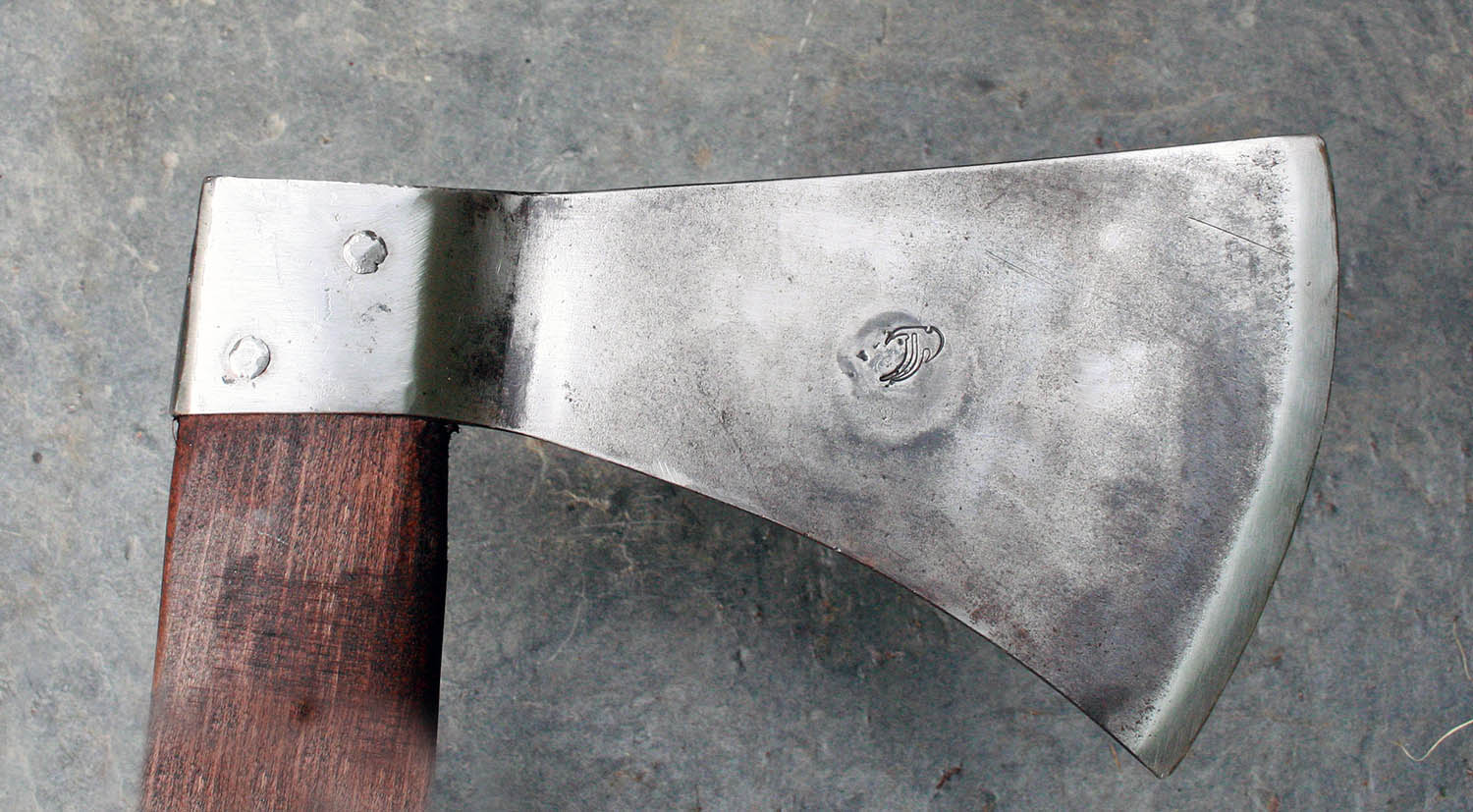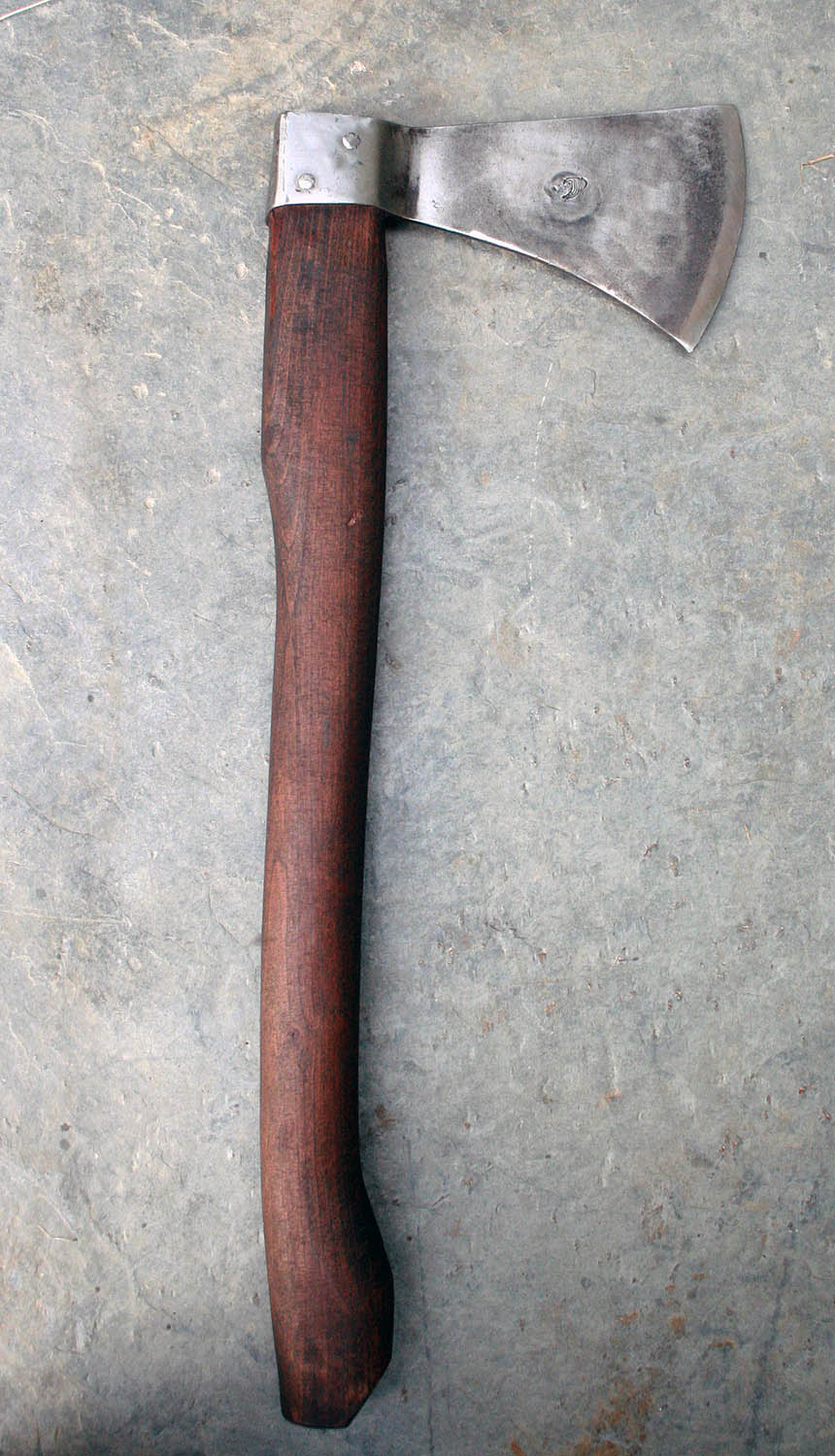 Hache de lancer en 54SiCr6 (acier à ressort) - 16cm de long - 8cm de tranchant - manche en fêne de 45cm. Poids : 826g