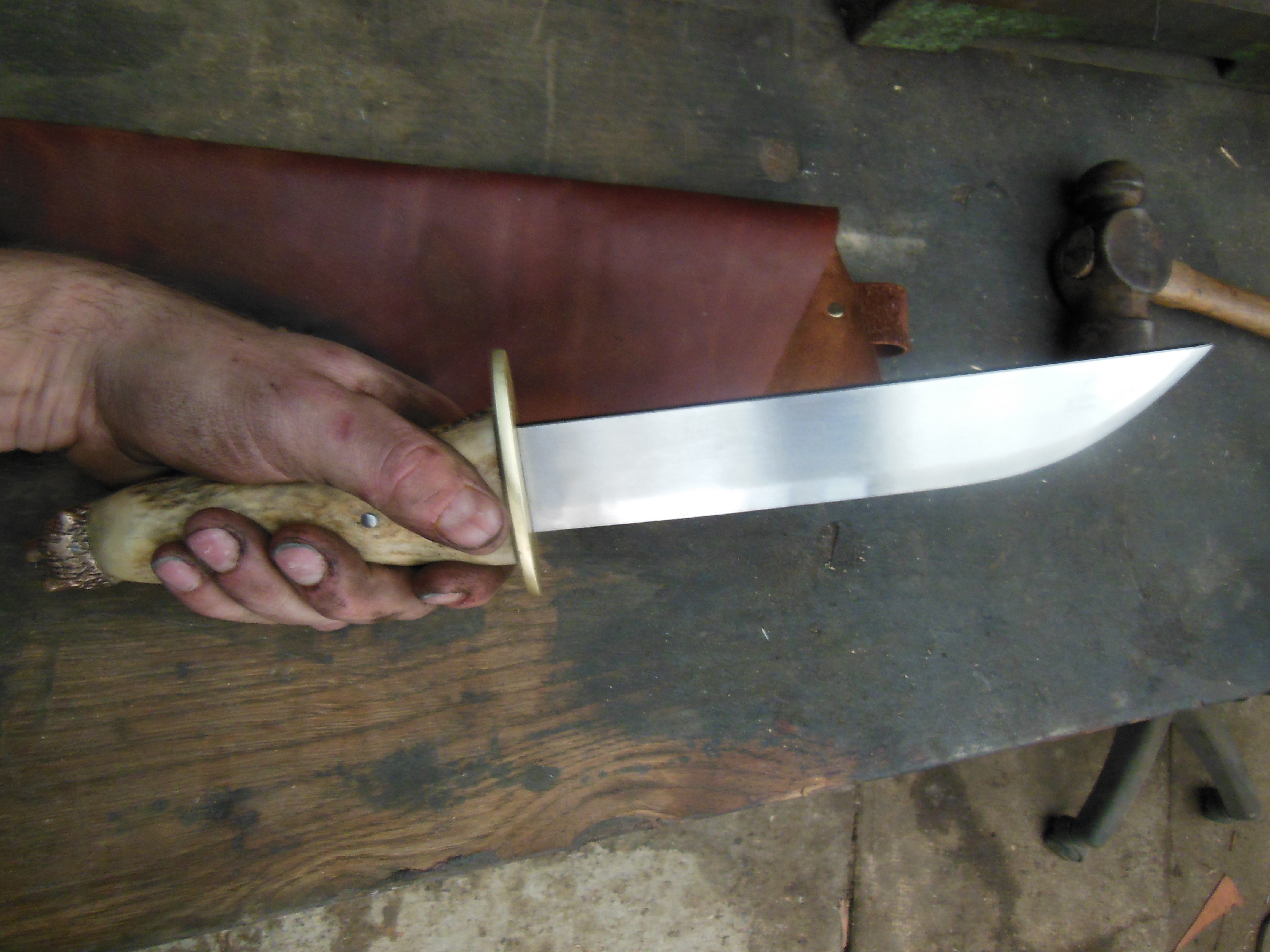 Couteau réalisé sur mesure pour mon pizzaiolo préféré. Lame de 21cm - Acier XC90 - manche de 13cm - Epaisseur 3.5mm au dos - Pommeau "Ours" en bronze moulé - manche en élan - garde en laiton.