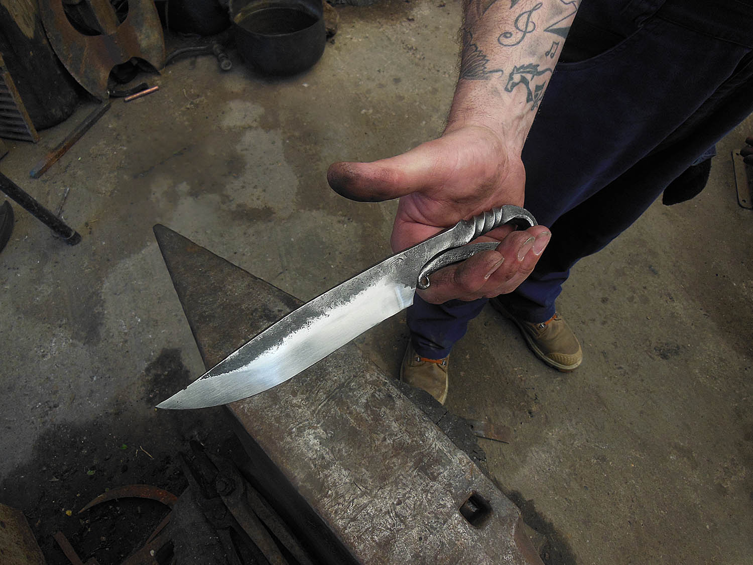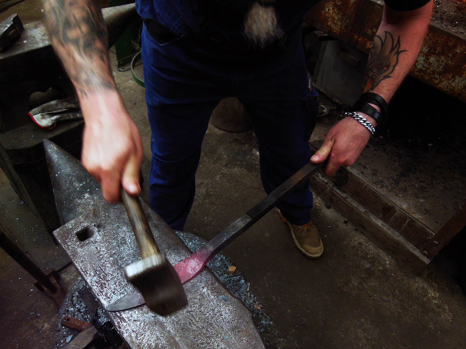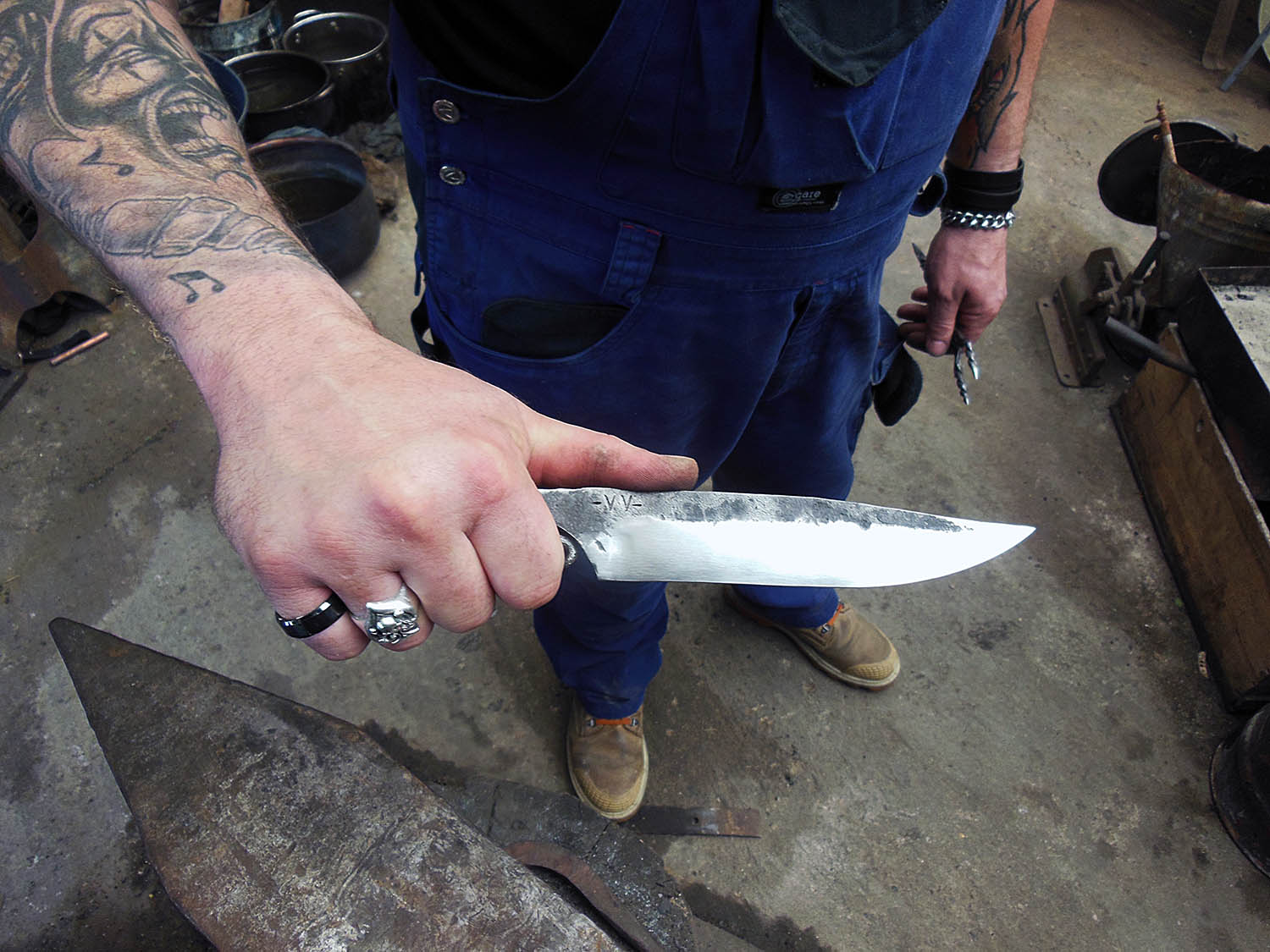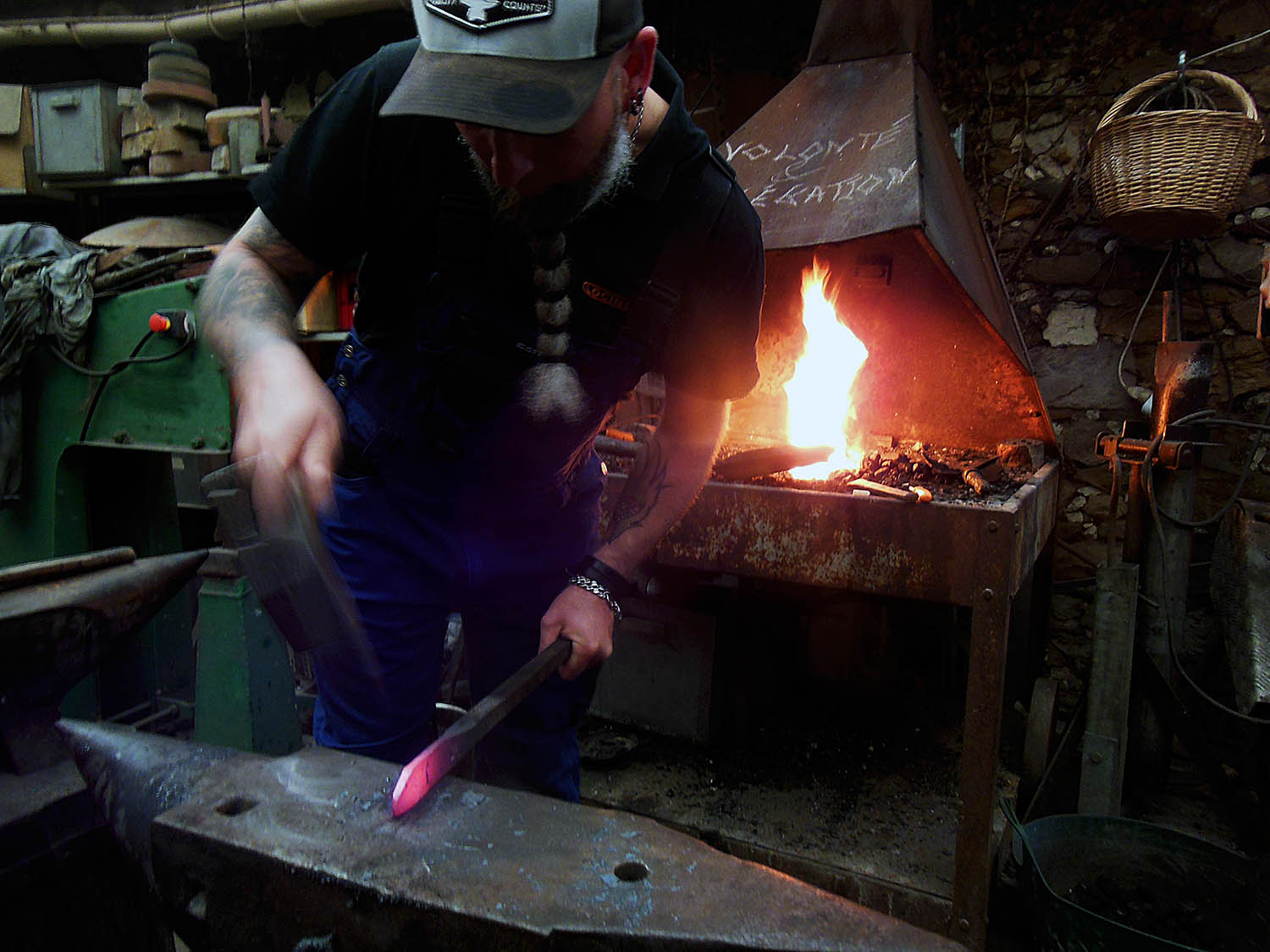 A la forge, j'ai eu le plaisir de recevoir Hervé, un grand balaise plein de tatouage et de poil, un grand spécialiste de la métallerie et de la forge industrielle. Pour lui c'était une grande première de travailler le marteau à la main, et ce fut parfait. D'après ses dires, il m'a même dit, avoir rarement été autant épuisé tellement il avait tout donné. Faut dire qu'il n'a pas chomé, ni sur le couteau, ni sur la mega fourchette qui va avec !!!
