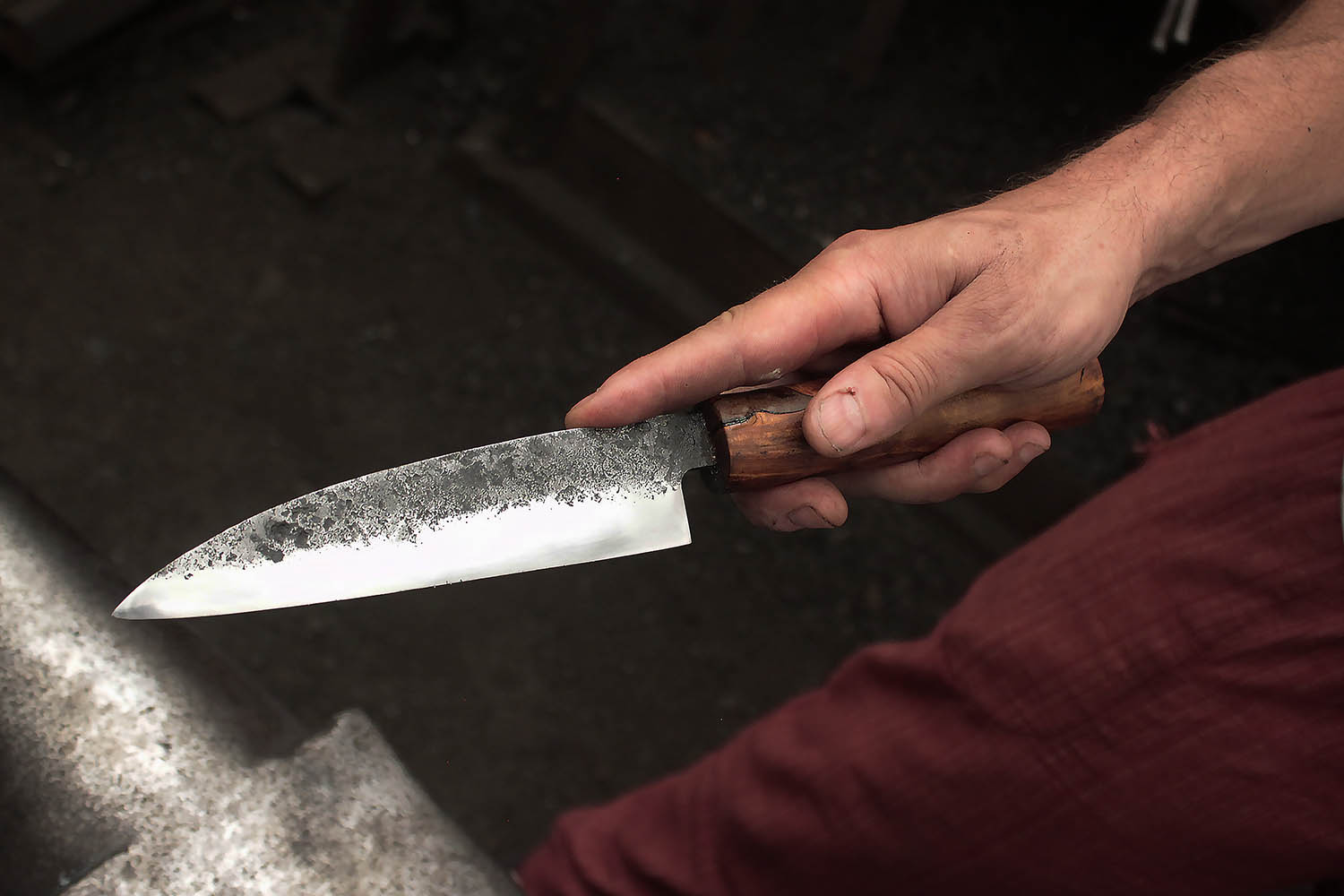 Superbe couteau pour ce passionné de cuisine qui a bravé la canicule pour faire cette magnifique lame avec manche en prunier sauvage du jardin; Bien joué !