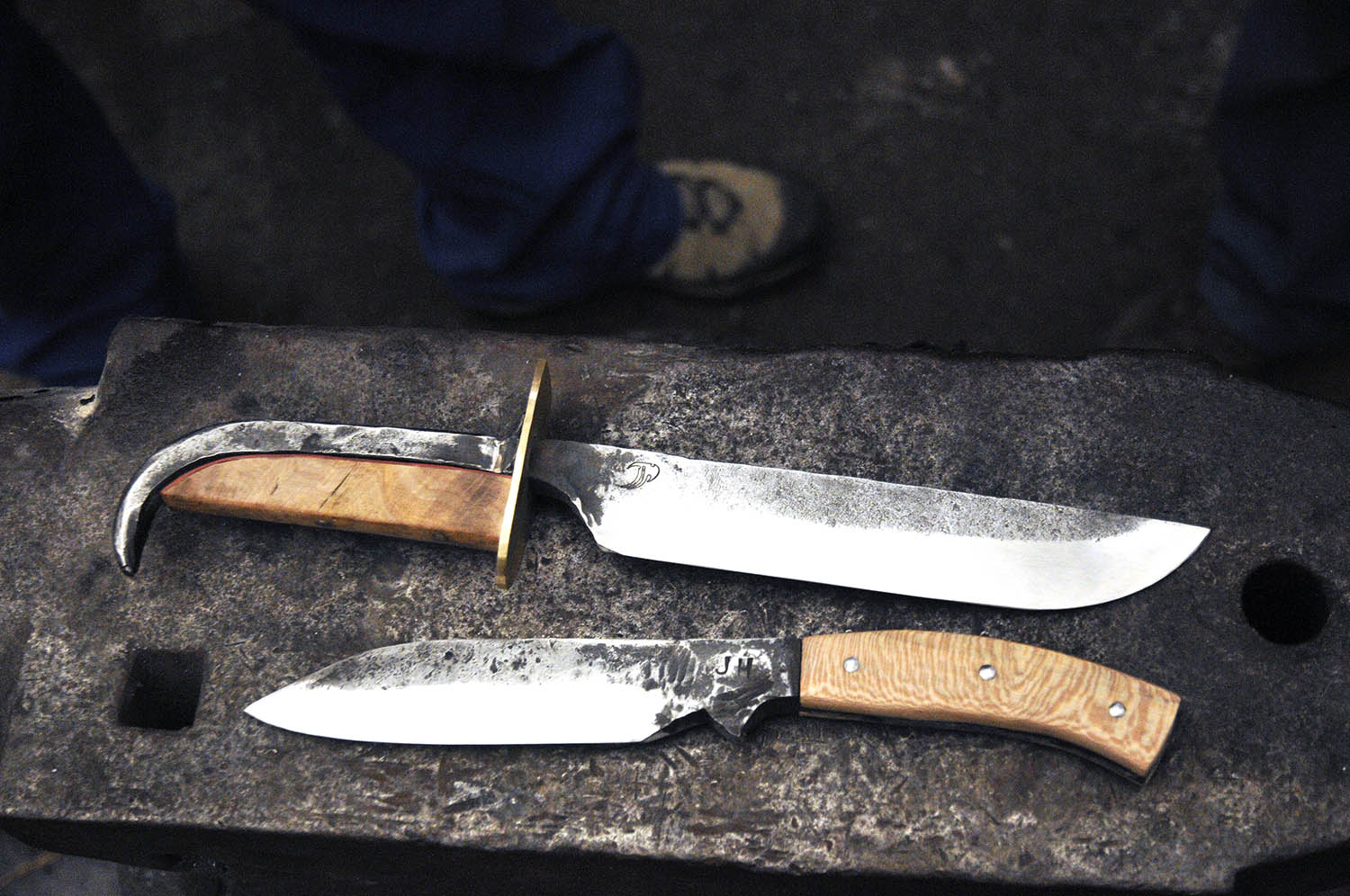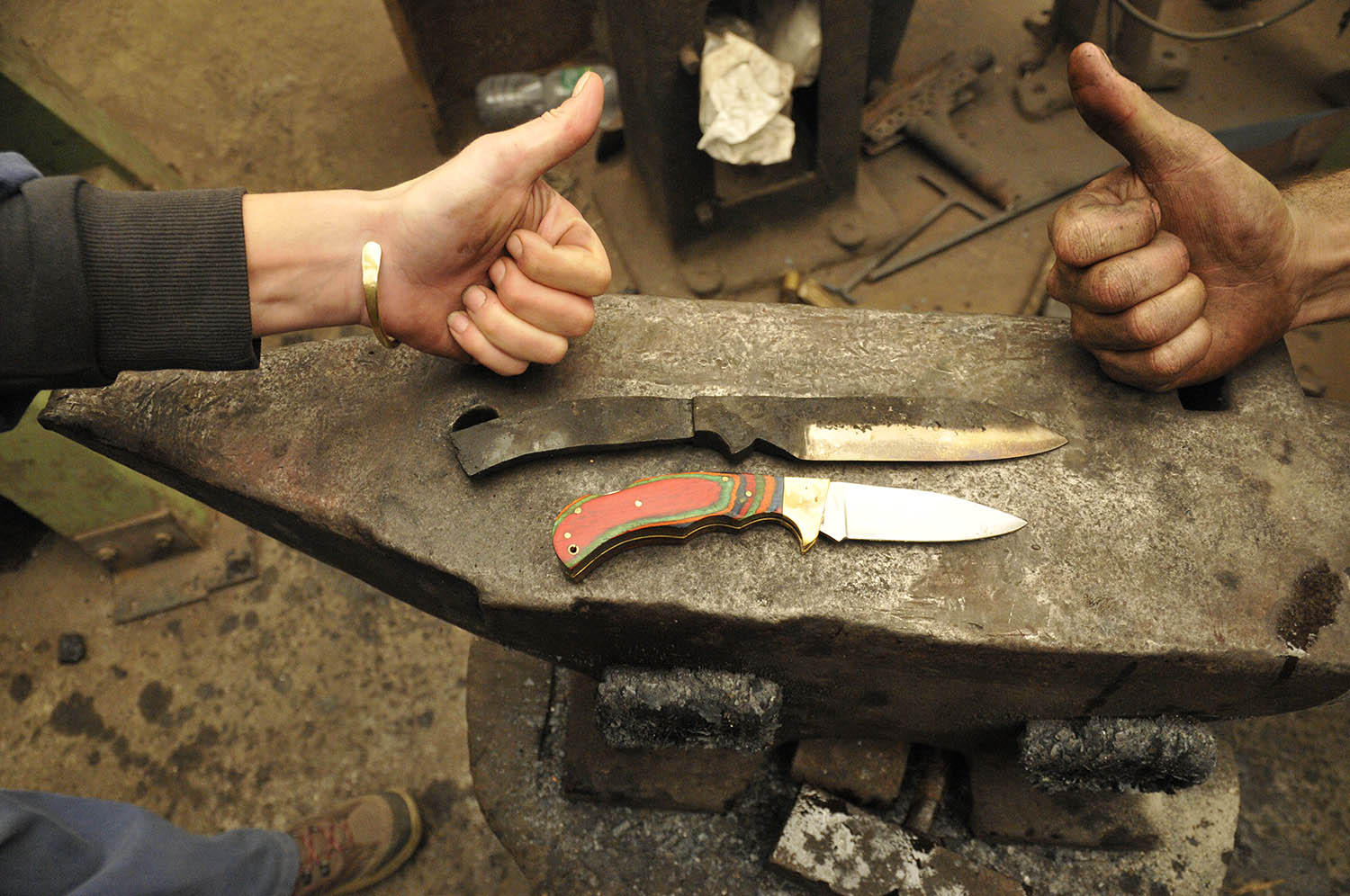 Les amis, je peux vous dire que là, on a eu des courageux. Julie et Romain sont venus de Belgique pour partager un moment entre amis, Romain à œuvré sur une lame "space marines", inspirée des couteaux de Warhammer 40k. Quand à Julie, elle a réalisé en version "fixe", un couteau pliant qui lui est très chère. 2 lames superbes, et un moment très chaleureux.