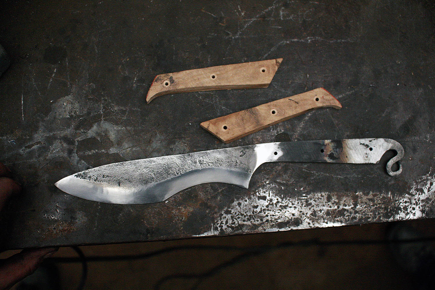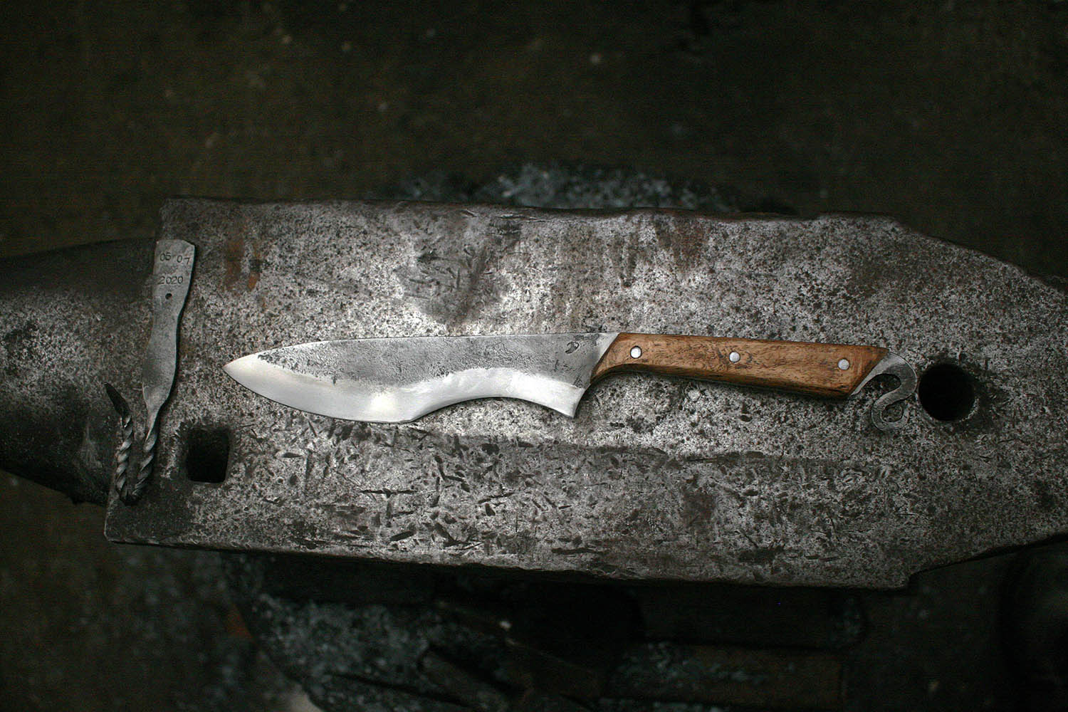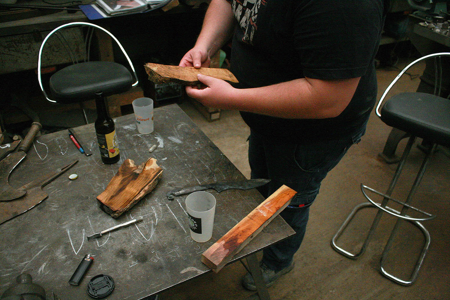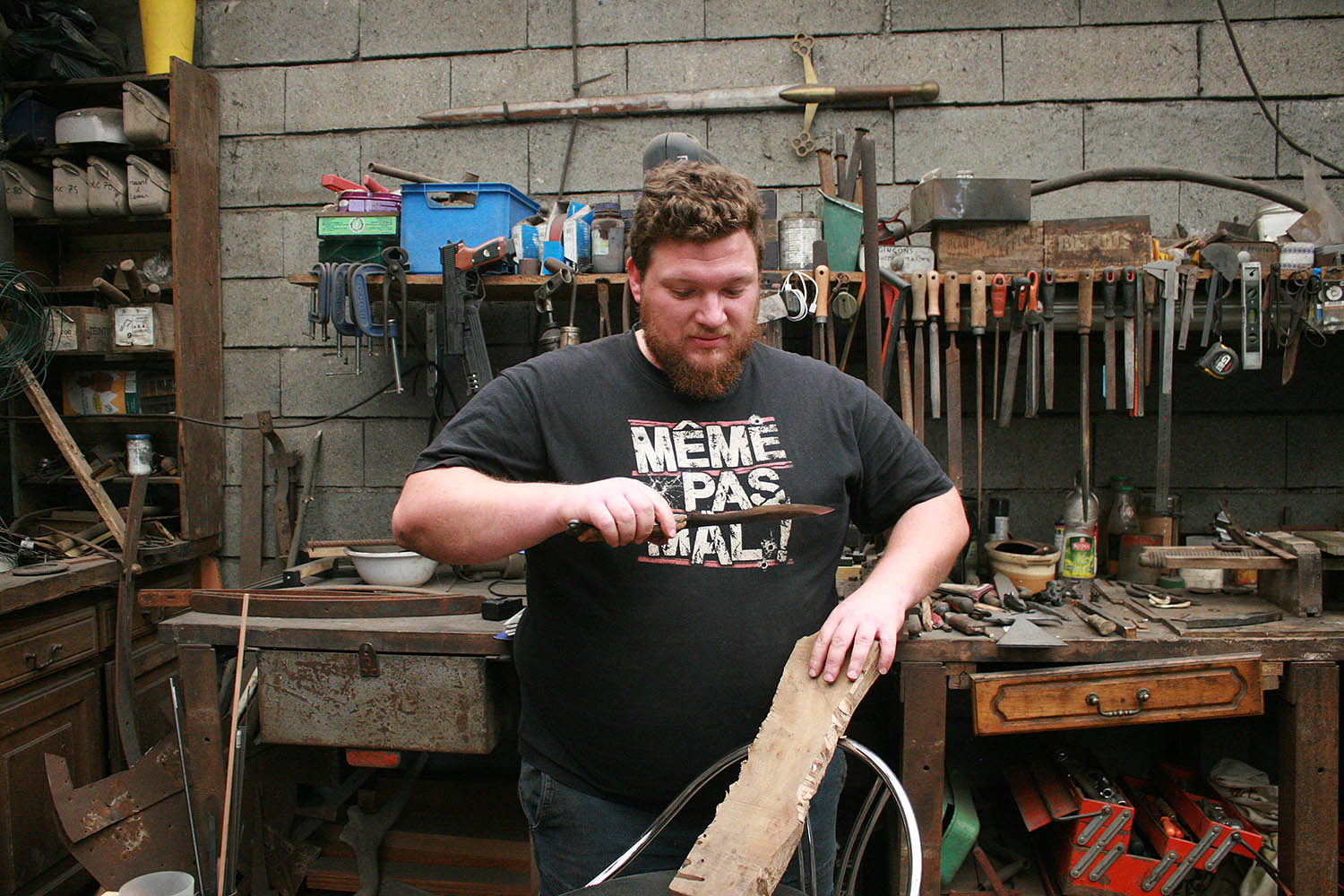 Envoyé en stage de forge par sa compagne, Rémy est vennu plein d'enthousiasme s'essayer au son du marteau et de l'enclume. Au programme, une tres belle lame et un bois superbe !