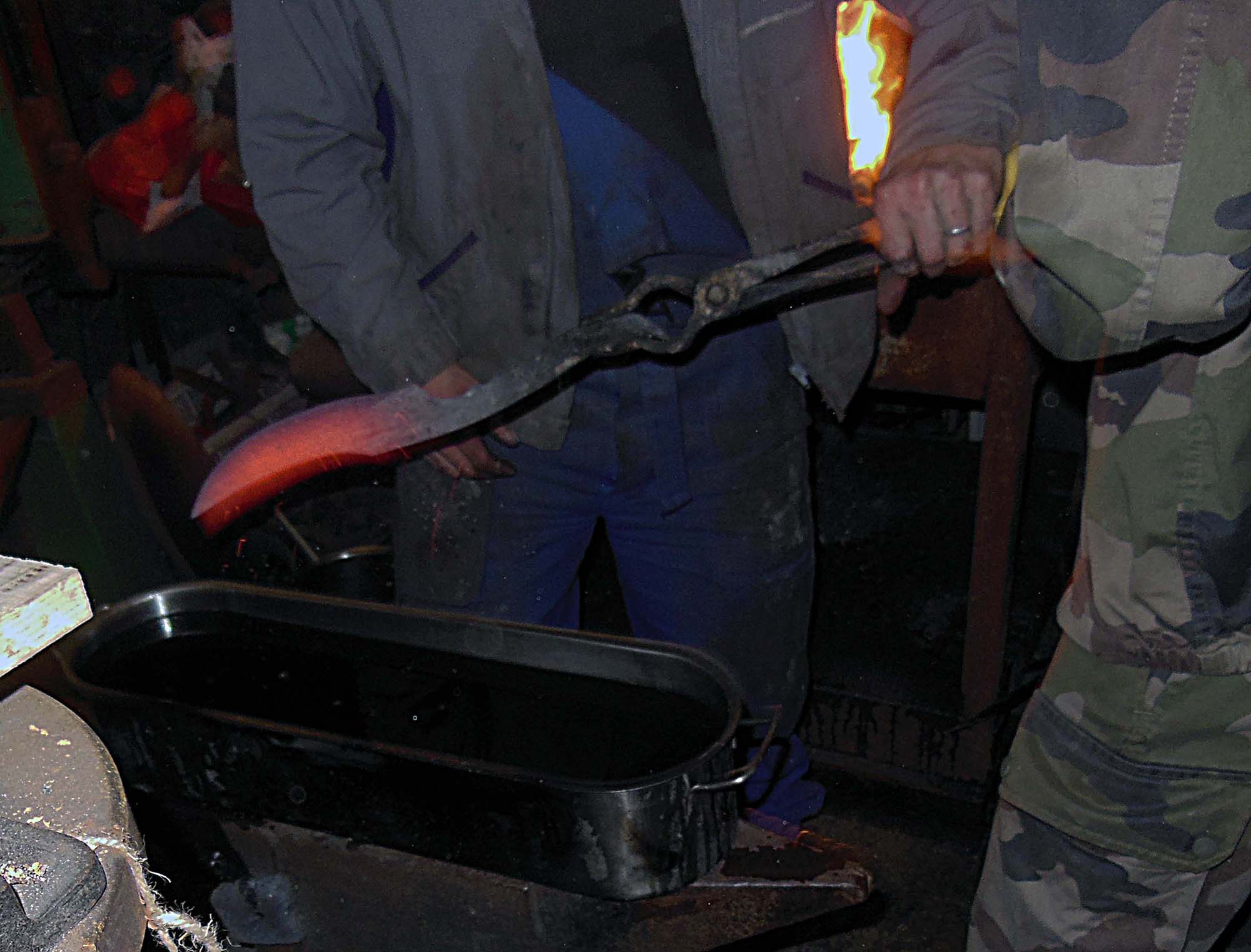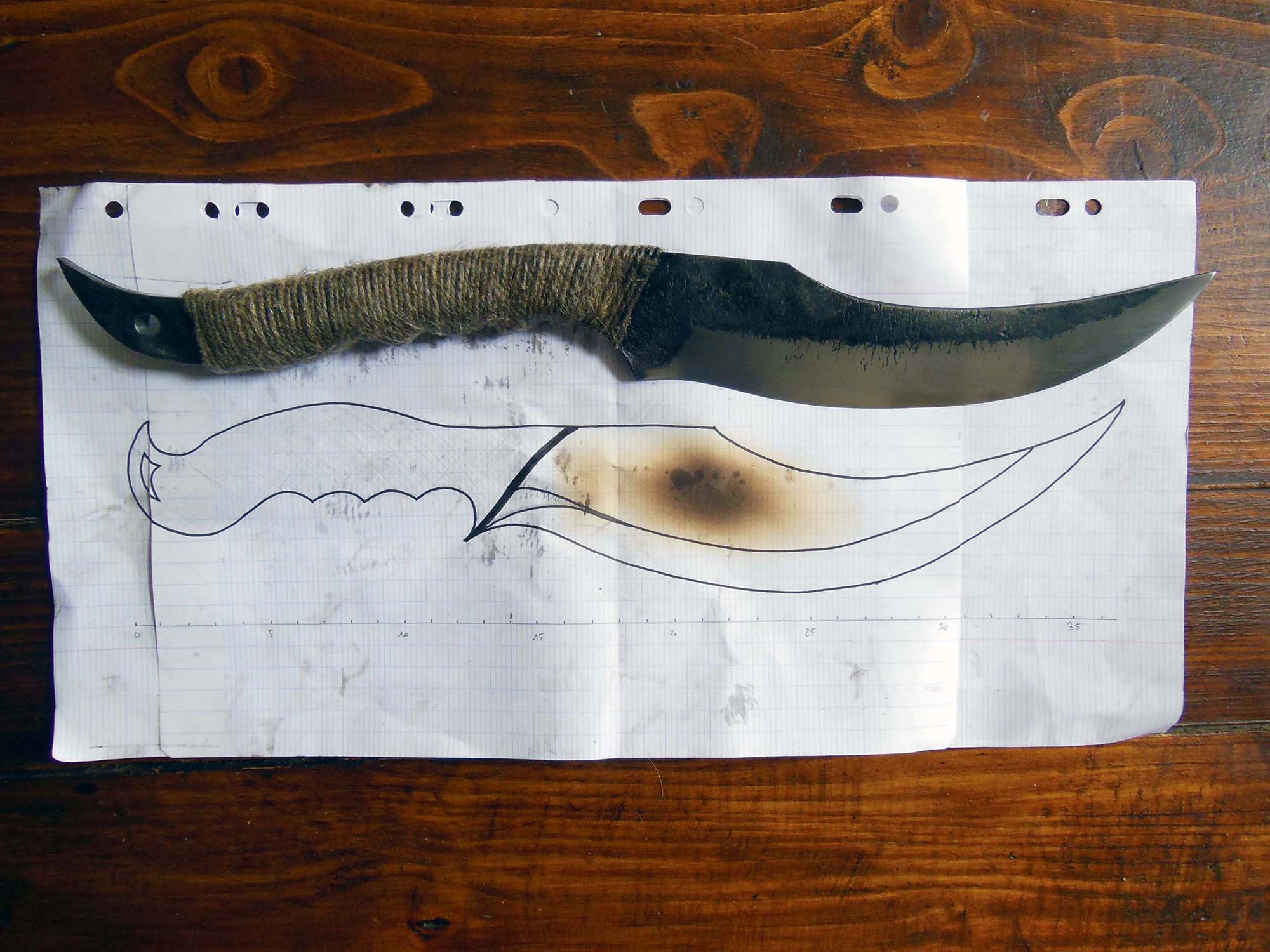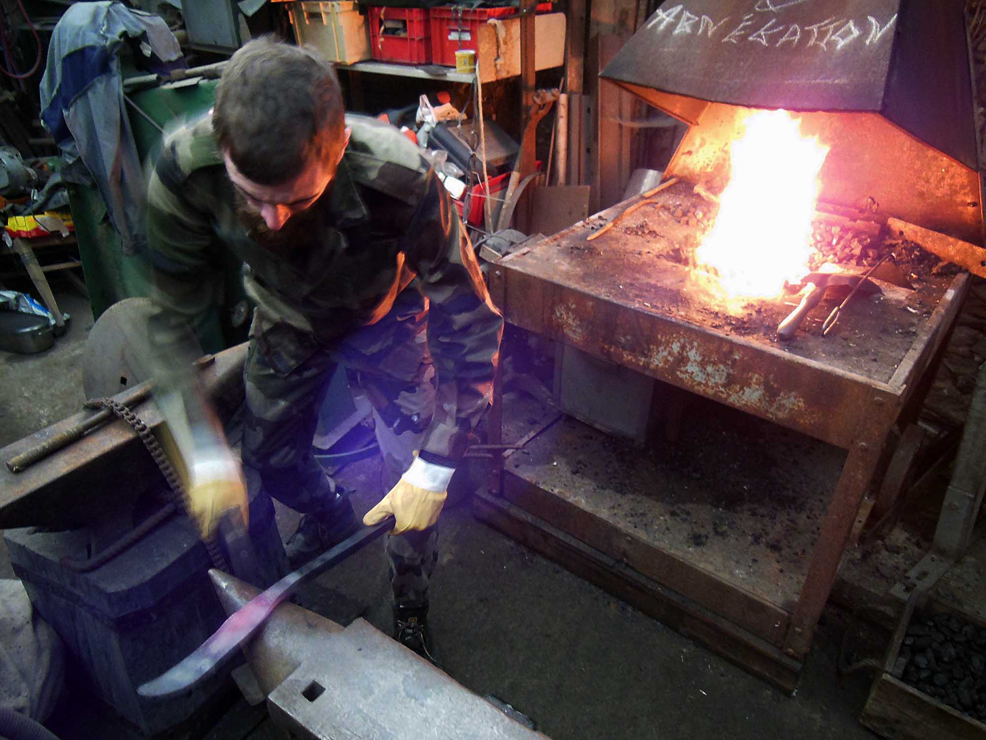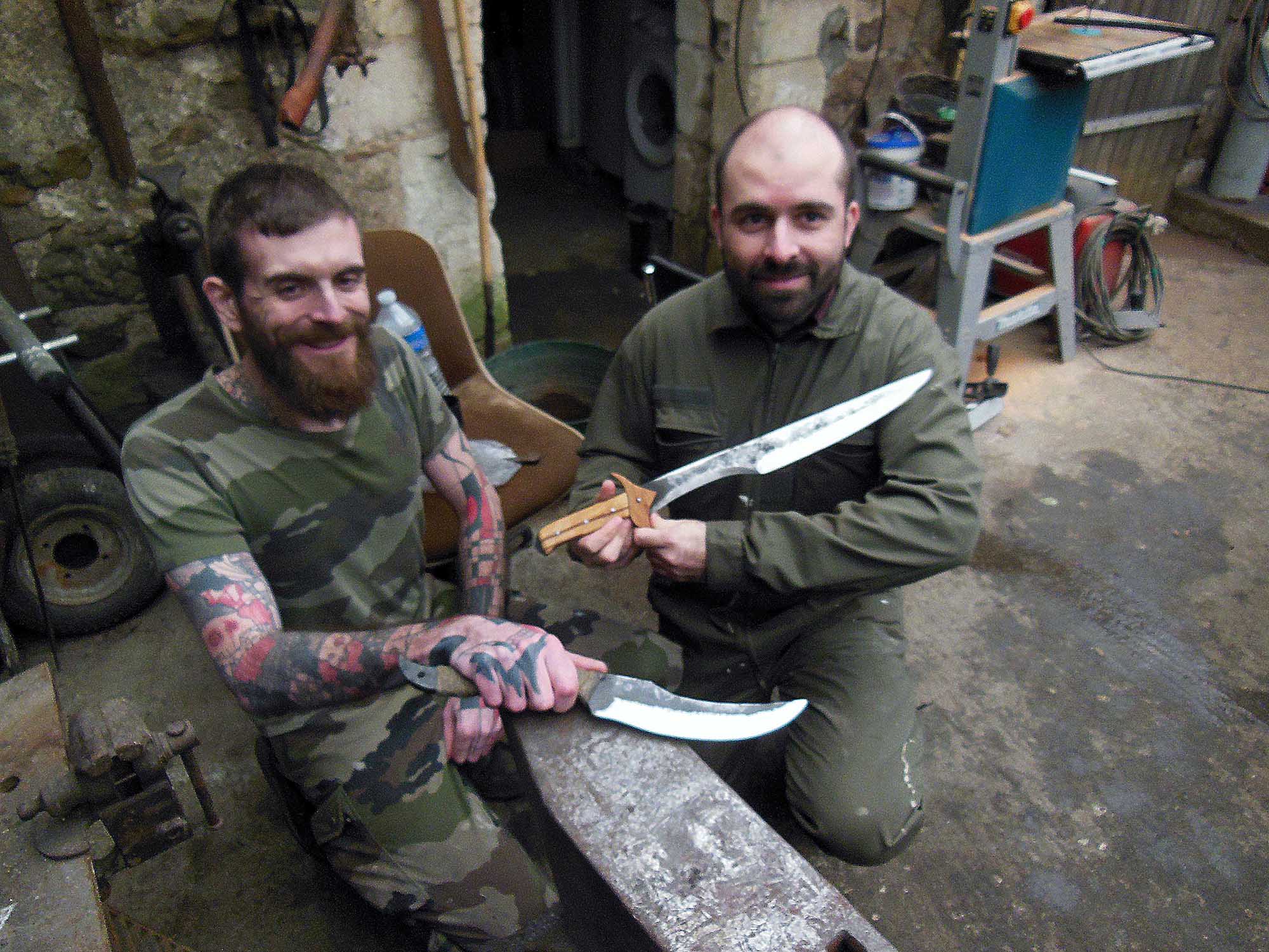 2 amis de longue date, une paire de treillis et de rangers pour 2 lames sur mesure. Matthieu s'est fait un énorme couteau brute de forge et Sebastien lui une très longue lame avec garde sculptée sur un design général basé sur Orcrist, "le fendoir à Goblin" de Bilbo le Hobbit ! Super cool de travailler sur des dessins précis !