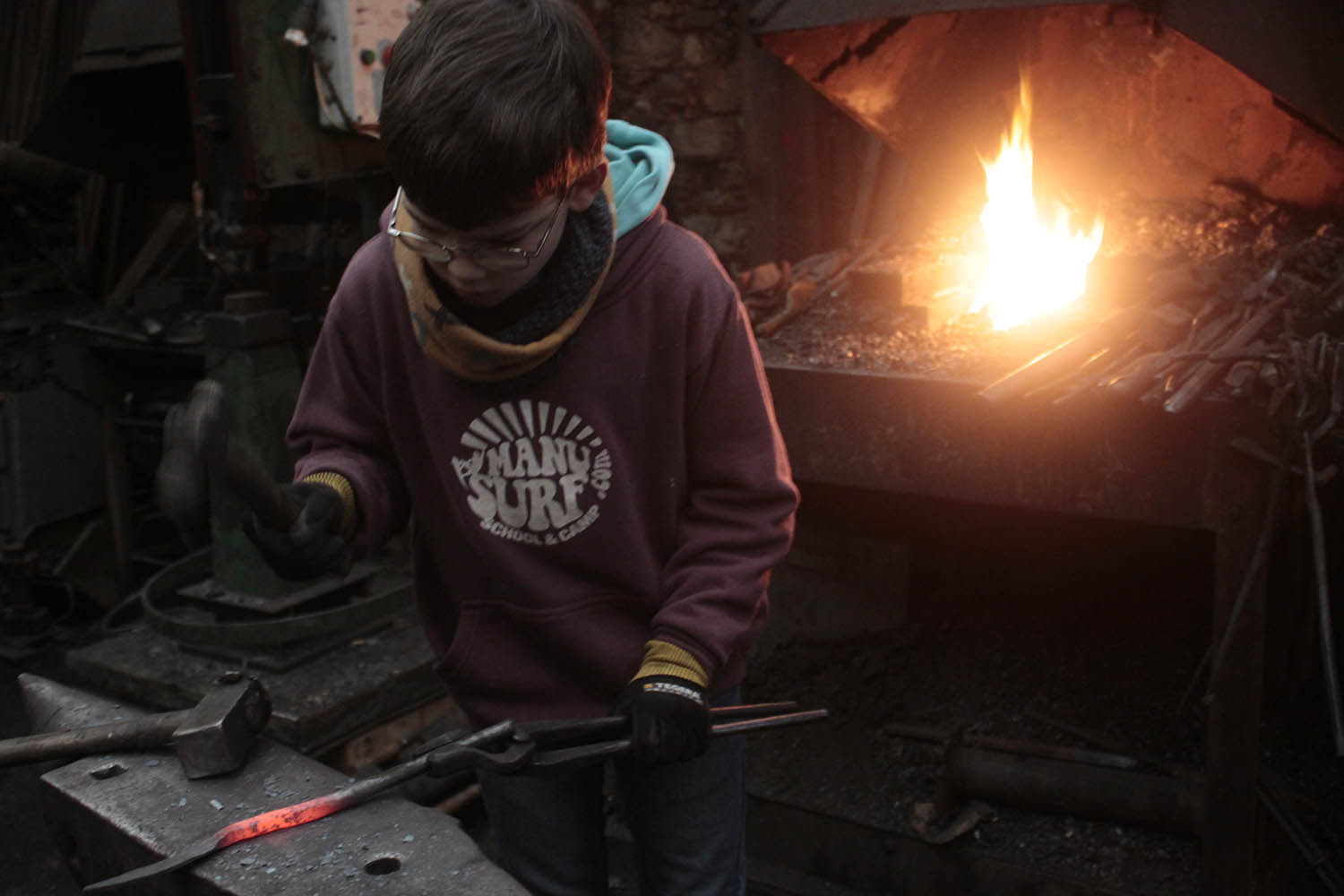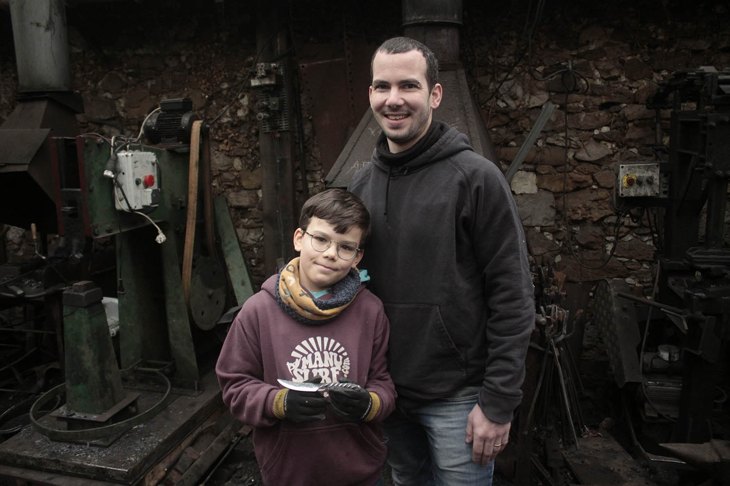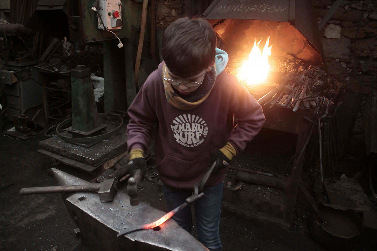 Noah, 10ans, effectue son premier stage de forge sous l'oeil de son papa.